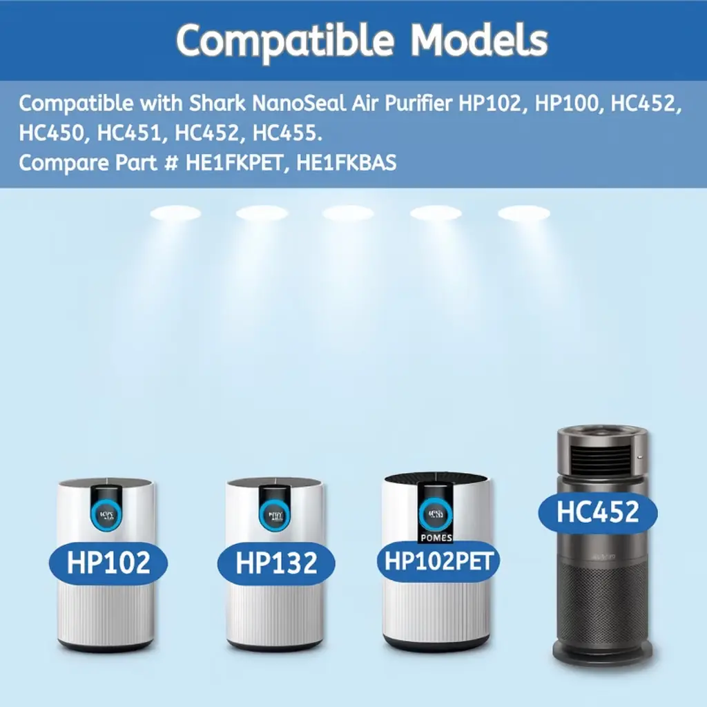 Premium 3-in-1 True HEPA + Activated Carbon filter replacement For Shark air purifier HP102, HC452, HP100, HC450, HC451, HC455. Compared to part HE1FKPET and HE1FKBAS. High quality HEPA filter capture 99.97% of airborne particles down to 0.3 microns. Activated Carbon captures household unfavorable Odors & harmful VOCs. Preliminary filter prevents any large particles such as hair, debris, pet fur etc getting side the air purifier. It helps extend the filter life span. 3 filters included. Suggest replacing the filter every 6 months the most to optimize the performance.