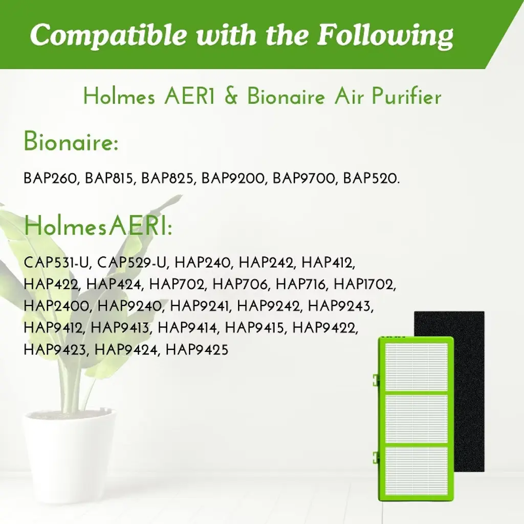 QUALITY AIR FILTERS: 4 premium 3-in-1 HEPA Carbon filters with 4 pre filters compatible with Holmes and Bionaire air purifiers. 3 STAGES FILTRATION: HEPA filters remove up to 99.97 percent of airborne particles as small as 0.3 microns. Activated carbon eliminates smoke and other household odors from cooking, pet and chemical. Preliminary filter in fiber to capture large particles such as hair, dust and debris. CARBON PRE FILTER: Another layer of protection to prevent any hair, dust etc from entering the filter. It also removes any unflavorable houshold odor. COMPATIBLE WITH HOLMES AIR PURIFIERS: Usable with the following Holmes units: HAP242-NUC, HAPF300AH-U4R, HAPF30AT-U4R, CAP531-U, CAP529-U, HAP240, HAP242, HAP412, HAP422, HAP424, HAP706, HAP716, HAP9240, HAP9242, HAP9412, HAP9414, HAP9422 and HAP9424. BIONAIRE COMPATIBLE: Can be used with the following Bionaire units: BAP260, BAP815, BAP825, BAP9200, BAP9700 and BAP520.