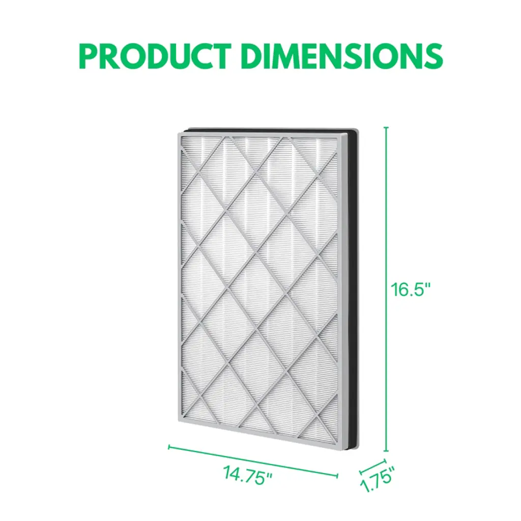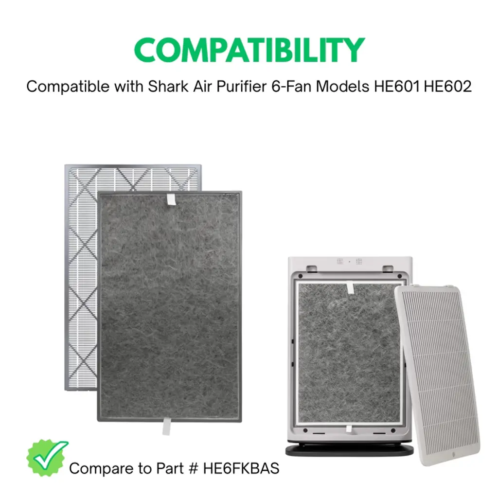 Premium True HEPA filter with activated carbon compatible with Shark air purifier 6 fan. It works with model HE600, HE601 and HE602. Compared to the original part HE6FKPET. High quality HEPA filter captures 99.97% of airborne particles down to 0.3 microns. Activated carbon removes any unfavorable household odor. Preliminary filter on one side prevents visible particle such as hair and dust from entering into the core device. Suggest replacing the filter every 6 months the most to optimize the performance of the air purifier. 1 filter included. Filter dimension approx. 24.75" x 15" x 1.62".