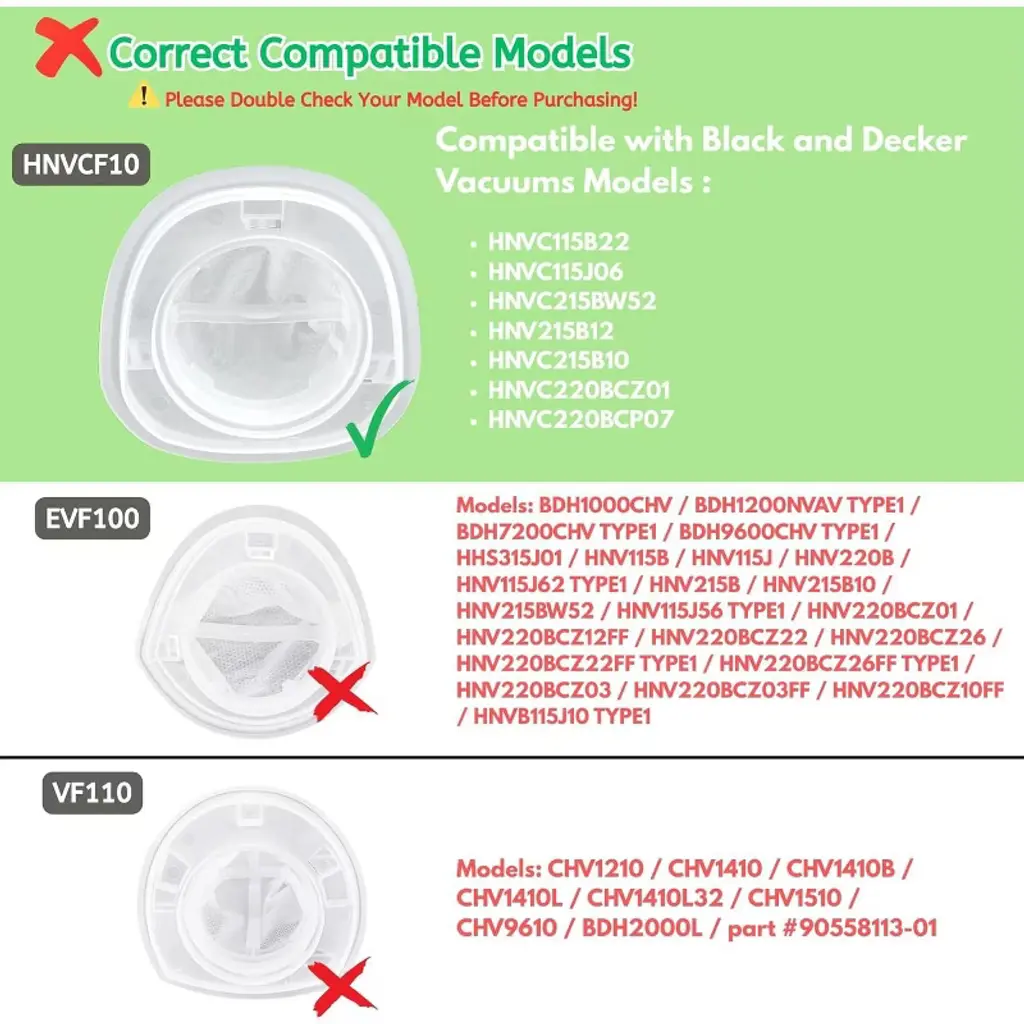 Nispira filter compatible with BLACK+DECKER Handheld Vacuum, Fit for Models HNVC220BCP07 HNVC215BW52 HNV215B12 HNVC215B10 HNVC115J06 HNVC115B22 Compared to original part # HNVCF10. Washable / Reusable - Simply rinse with clean water and let it completely air dry before reusing them. Easy to install. Just take out the old filter and put this in. Regular cleaning on the filter is highly recommeded to improve the suction. Suggest to replace the filter every 2-3 month to optimize the performance. 9 Filters Included. Size: 2.8" x 3.9" x 4.4"