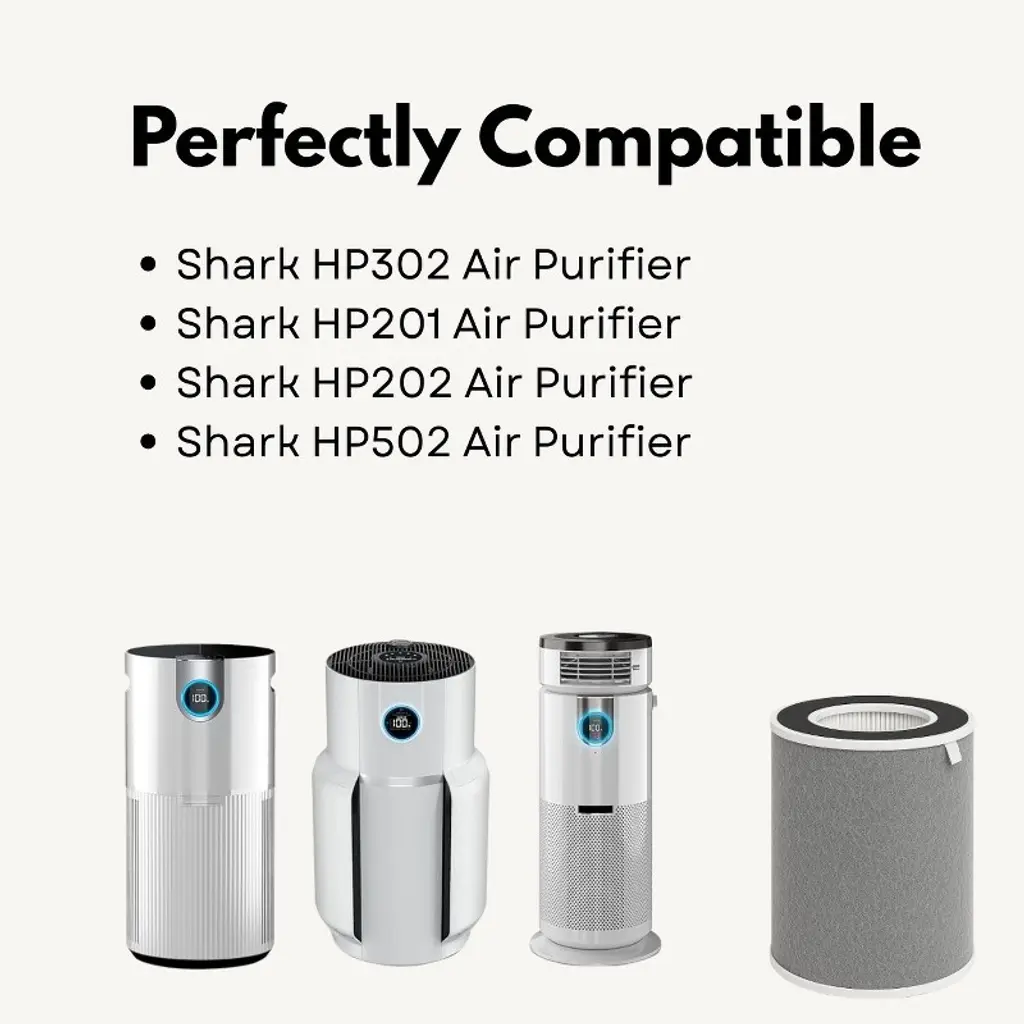 Premium 3-in-1 True HEPA + Activated Carbon filter replacement For Shark air purifier HP200 Series, HC500 Series and AP1000, UA205. Compared to part HE2FKBASMB, HE2FKBAS. Compatible with model HP201, HP202, HC502, HP501, AP1000, UA205. High quality HEPA filter capture 99.97% of airborne particles down to 0.3 microns. Activated Carbon captures household unfavorable Odors & harmful VOCs. Preliminary filter prevents any large particles such as hair, debris, pet fur etc getting side the air purifier. It helps extend the filter life span. 2 filter included. Suggest replacing the filter every 6 - 8 months the most to optimize the performance. Size 8.68" x 8.68" x 12.1".