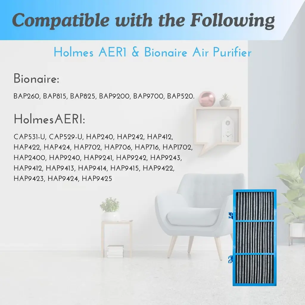 Nispira high quality, effective HEPA filter helps to purify the air by capturing particulates. Particles 0.3 microns and larger that pass through the filter are captured to help maximize comfort and freshness. Activated carbon removes any unfavorable household odor such as cooking, smoke, pet smell, VOC chemical etc. This filter is compatible with the following Holmes air filter units: HAP242-NUC, HAPF300AH-U4R, HAPF30AT-U4R, CAP531-U, CAP529-U, HAP240, HAP242, HAP412, HAP422, HAP424, HAP706, HAP716, HAP9240, HAP9242, HAP9412, HAP9414, HAP9422, HAP9424 and HAP9425B Mini Tower. It can also be used with the following Bionaire units: BAP260, BAP815, BAP825, BAP9200, BAP9700, BAP520 and BIONAIRE Mini Tower. It measures 1.2 x 10 x 4.6 inches and comes in a pack of 6. We recommend replacing your air purifier filters every 6 months to maintain effectiveness and efficiency. This is not a Holmes¨ OEM product. Holmes¨ is a trademarkª or registered¨ trademark of its respective holder. Use of it does not imply any affiliation with or endorsement by the holder. The trademark holder is not affiliated with Nispira and does not endorse this product. Any use of the name Holmes¨ or model Aer1¨ designation for this product is made solely for purposes of demonstrating compatibility.