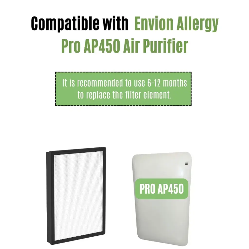 Nispira HEPA filter replacement compatible with Envion Allergy Pro AP450 Air Purifier. Compared to part AP450F (NOT for Whirlpool AP450. This is for Envion Allergy Pro AP450). 2 sets included. Approximate dimension 17.88" x 11.63" x 1.31". Suggest to replace every 6 months for optimal performance