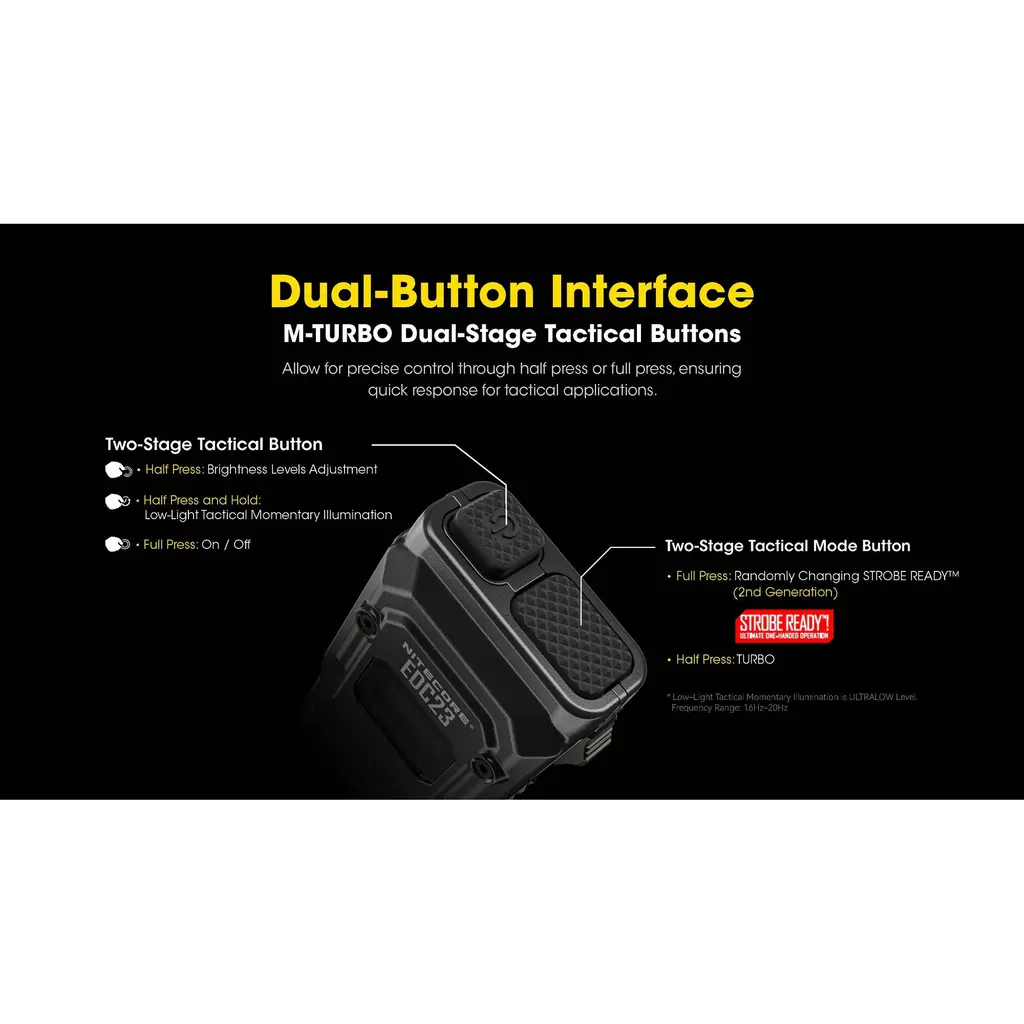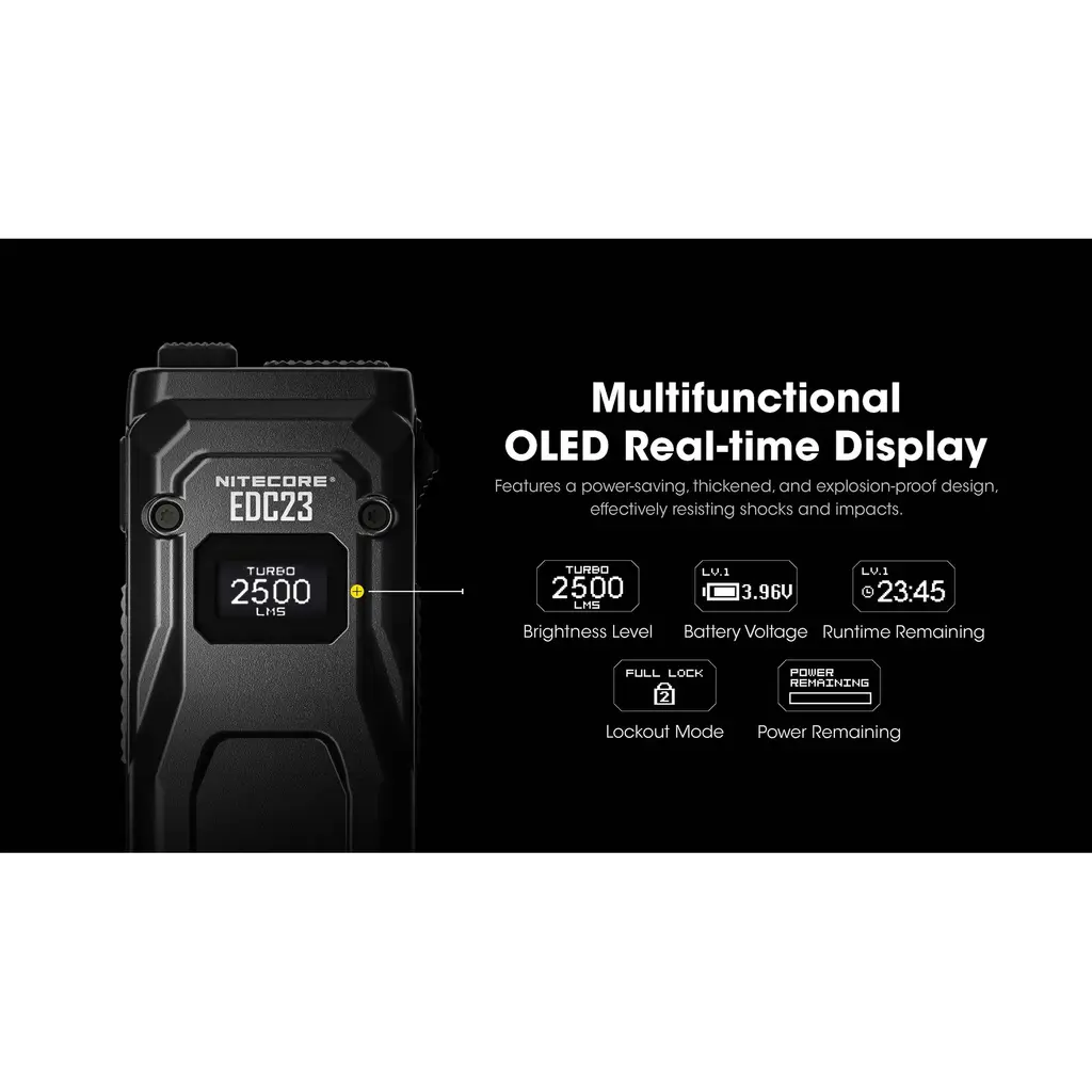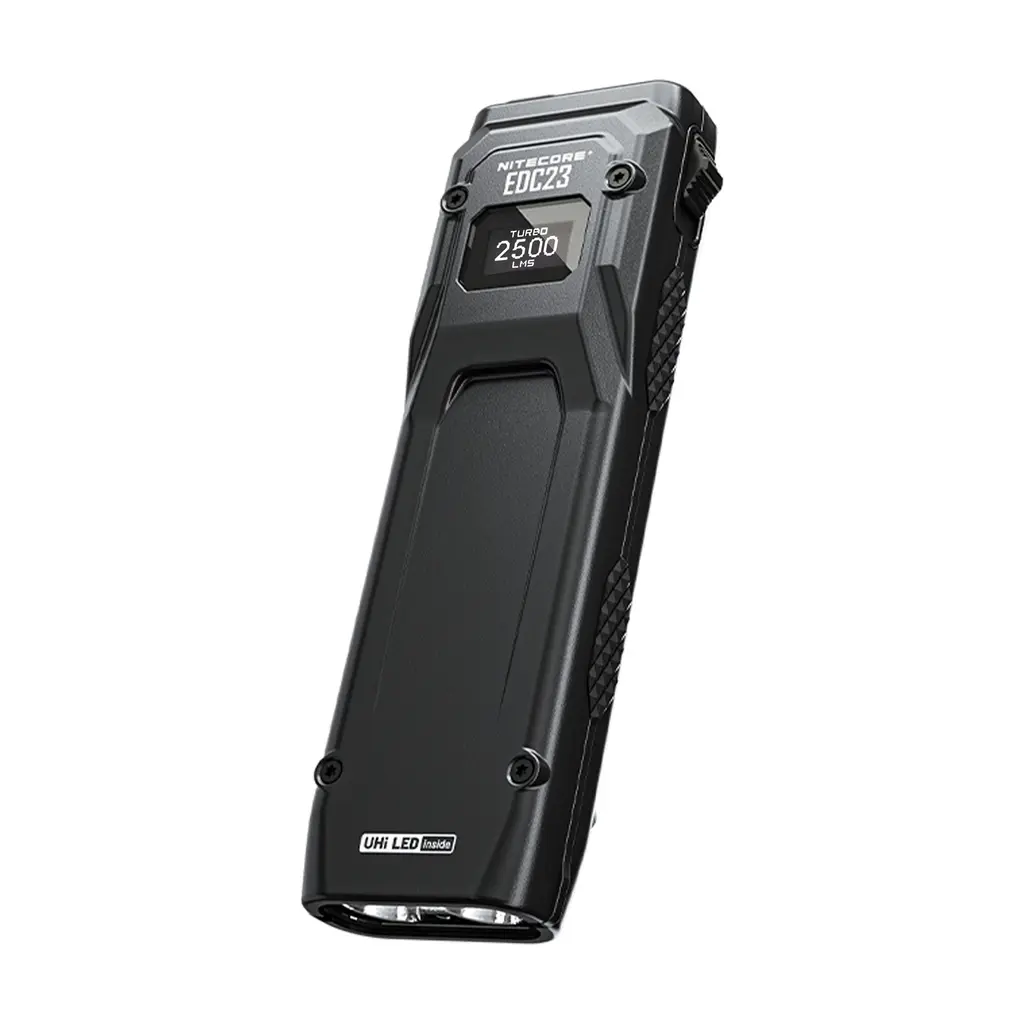 The Nitecore EDC23 offers everything you need and want in an EDC flashlight. It has exceptional brightness and throw, delivering an impressive 2,500 lumens and a beam throw of up to 306 yards. At just 4.05 inches, the EDC23 is the shortest flat flashlight in Nitecore's lineup to date, making it suited for everyday carry. Designed for versatility, it provides five brightness levels and a Strobe mode. If the light turns off, the EDC23 features memorization and will return to the previously used mode. Its digital OLED screen displays the brightness level, remaining battery power, and more. For quick access, half-press and hold the mode button for Turbo, or fully press and hold it for Strobe. This makes EDC23 an excellent tactical flashlight as well. To prevent overheating, the EDC23 automatically reduces brightness if accidentally activated in High mode. This feature activates only when the light is turned on unintentionally and deactivates during regular use.The EDC23 can be conventionally charged through its built-in USB-C port. Once fully charged, the EDC23 can achieve a maximum runtime of 39 hours on its lowest mode and can be fully charged in just 1.5 hours. Additionally, the EDC23 features an easy-to-use sliding lock switch to prevent accidental activation. It comes with two lockout modes: Semi and Full. In Semi Lockout, you can Turbo and Strobe, while Full Lockout will disable all functions. At a weight of only 3.56 ounces, the EDC23 is easy to carry wherever you go. It is also weatherproof with an IP54 rating, and has 2-meter impact resistance, ensuring reliable performance in any environment.