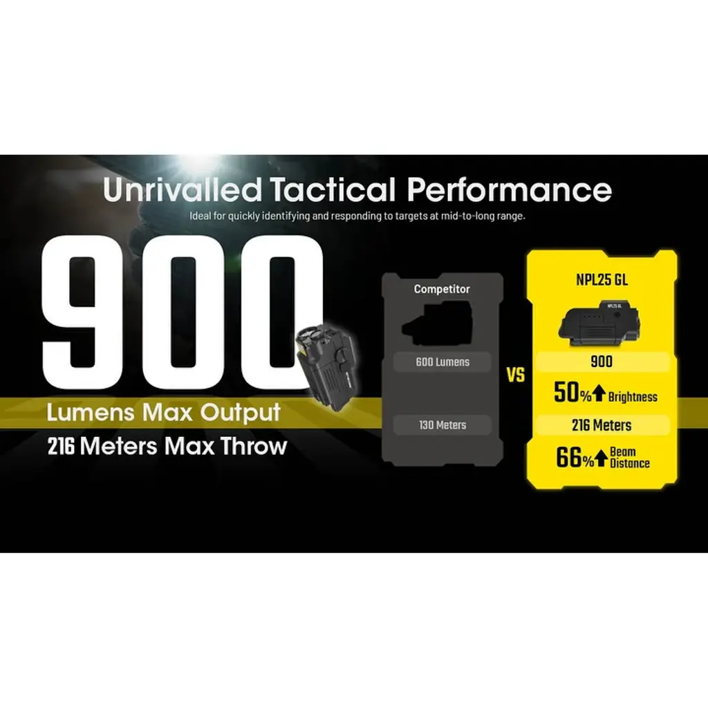 DescriptionThe Nitecore NPL25 GL takes everything you love about the NPL25 like its powerful illumination and reliability and now includes an integrated 520nm green laser for enhanced precision. The output of the green laser is <5mW and the class is 3R. Ideal for personal safety or range applications, the new green laser adds essential accuracy and versatility to your lighting tool. With a maximum output of 900 lumens and a throw of 236 yards, the NPL25 GL is compatible with most compact and full-size setups. Its ambidextrous switch design supports both left- and right-handed users, and it offers three modes: White Light, Green Laser, and a combination of the two. Short-press either switch for continuous lighting, or press and hold for momentary illumination. To change brightness levels, double-click either power button, and to switch between modes, hold one switch while short-pressing the other. The NPL25 GL allows for easy charging without removing it from your setup. Simply slide out the battery and connect it to the magnetic charger, then plug the other end into a separate USB-C power supply. The recharge process takes only 1 hour and 10 minutes, and a power indicator keeps you informed about your remaining battery life. Compact and lightweight, the NPL25 GL measures only 2.44 inches long and weighs 2.61 ounces. Its recoil-proof and durable design, IPX6 rating, and impact resistance of up to 1 meter make it a reliable and bright illumination choice suitable for all terrains.Specifications FeaturesContent in Package: Nitecore NPL25 GL;Magnetic charging cable;Rail Adapter;Small Wrench;Large Wrench;Screw x 4