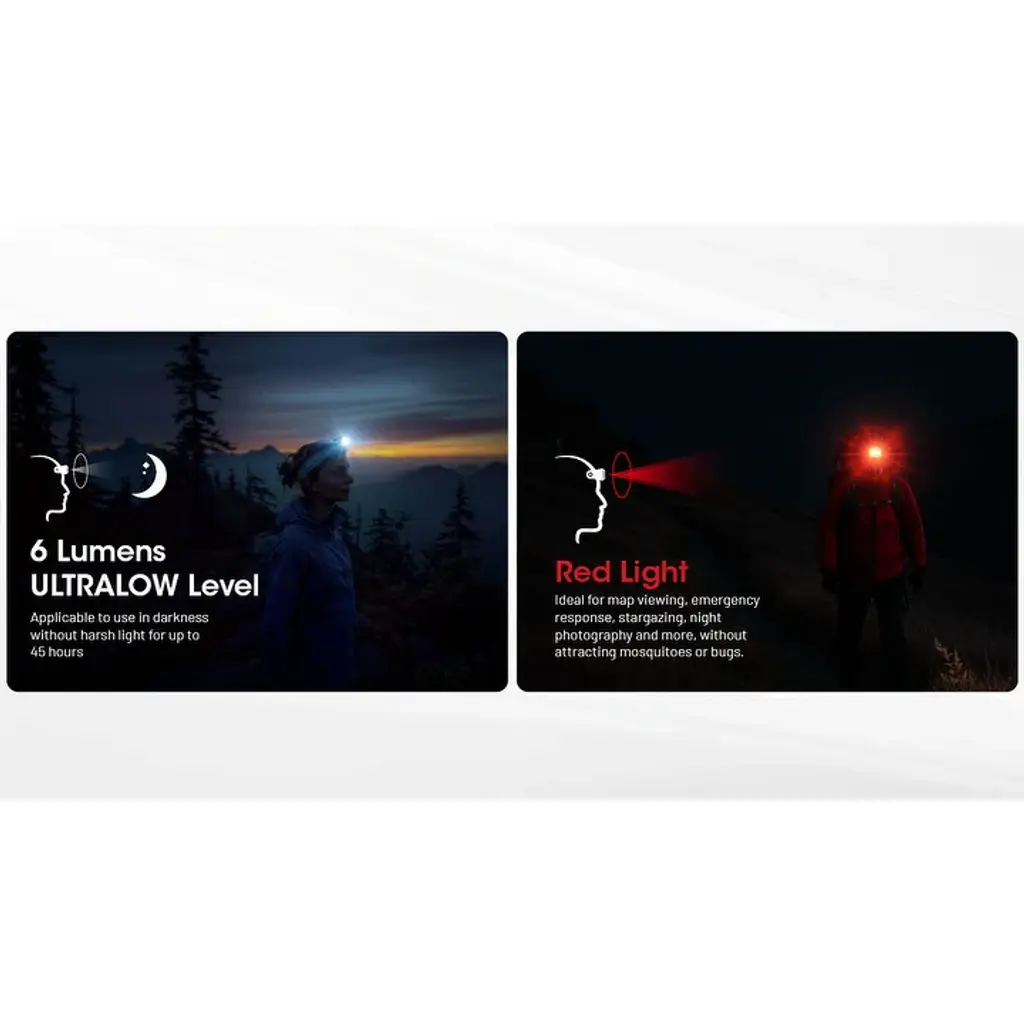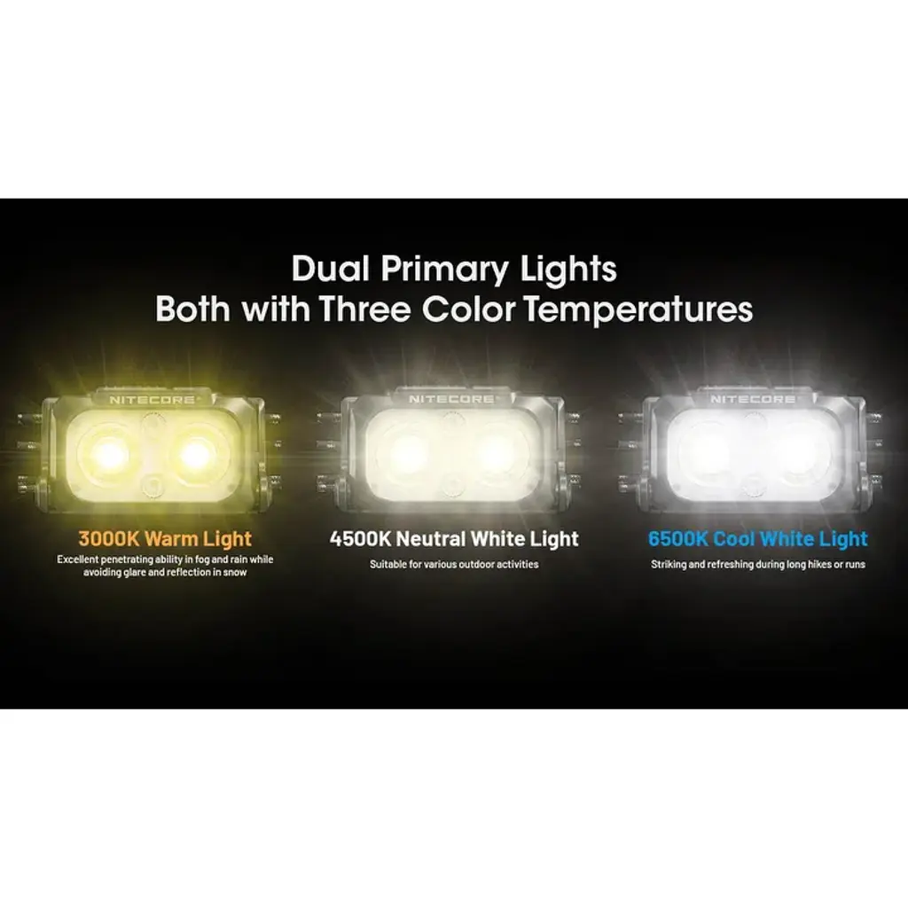 The Nitecore NU25 MCT UL headlamp is the ideal ultralight companion for various activities such as camping, hiking, trail running, and more. Its ultra-high efficiency (UHE) LEDs are able to emit a bright 400 lumen beam that can reach distances of up to 144 yards. With its new Multiple Color Temperature (MCT) LEDs, the NU25 MCT UL lets you switch between warm, neutral, and cool light, which maximizes your visibility and comfort no matter the weather, terrain, or lighting condition. Warm Light (3000K) is easier on your eyes and is able to cut through fog and rain. Neutral White (4500K) offers a clear and natural light for various day-to-day activities while Cool White (6500K) is for enhanced visibility in outdoor environments. The NU25 MCT UL offers remarkable versatility with up to four different brightness levels that are able to shine in whatever color temperature you choose. Alternatively, switch to the Red Light mode to protect your night vision or use it as a long-lasting signal light with three red modes: Low, High, and Slow Flashing. The NU25 MCT UL also features modes like SOS and Beacon to assist you in any emergency.The NU25 MCT UL is ultralight with easily adjustable elastic cords, bringing its total weight to just 1.65 oz—perfect for backpacking, night running, or any outdoor adventures. With a 700mAh rechargeable battery, it can achieve a maximum runtime of 45 hours on its lowest setting. It also has a USB-C port for easy charging, taking only a little more than an hour to reach full power. A power indicator lets you know when to recharge, and the lockout mode prevents accidental activation. The NU25 MCT UL is also rated IP66 waterproof and can withstand impacts of up to 1 meter, making it a reliable companion for everyday tasks, camping, hiking, and more, in any environment.