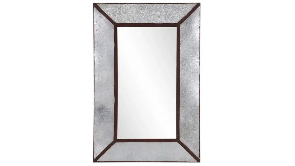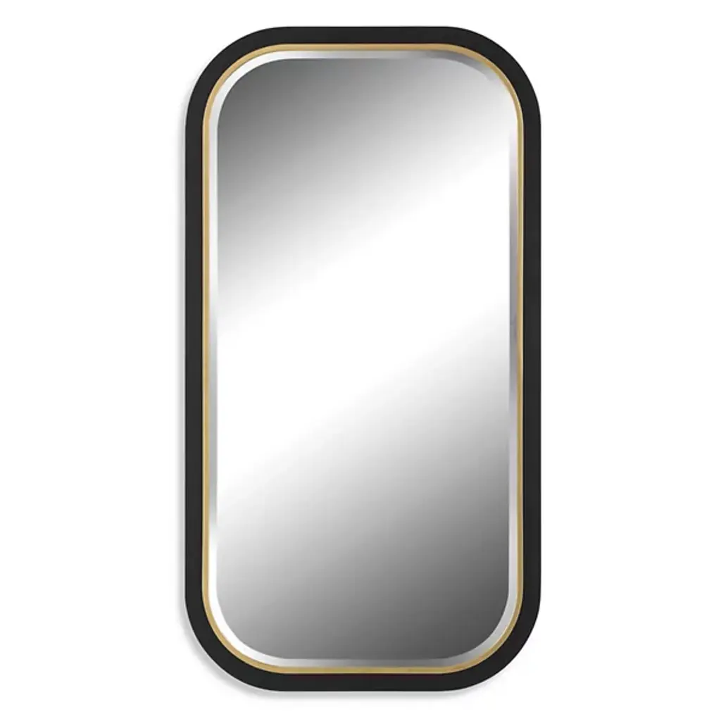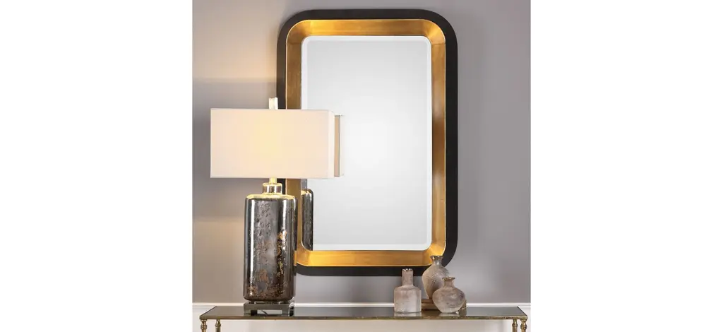 Deep forged iron with tapered sides finished in a lightly antiqued metallic gold leaf on the inside, and a heavily distressed black with gold undertones on the outside. Mirror has a generous 1 1/4" bevel. May be hung horizontal or vertical.