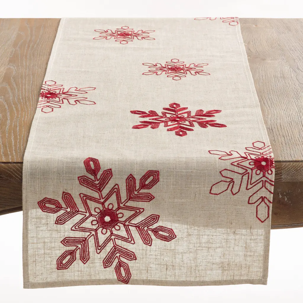 Featuring a simple, light-toned background, and large, uncluttered snowflakes, the Christmas Table Runner With Embroidered Snowflake Design is a beautiful backdrop for any table décor. It's easy to pair and match with a wide range of dinnerware and table decorations. Use with linen placemats and table napkins.Sizes available:Colors available:Features: