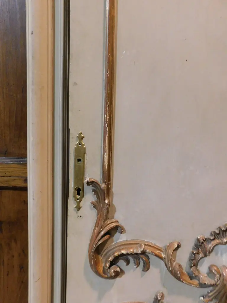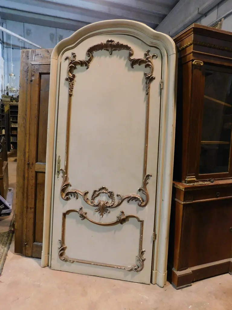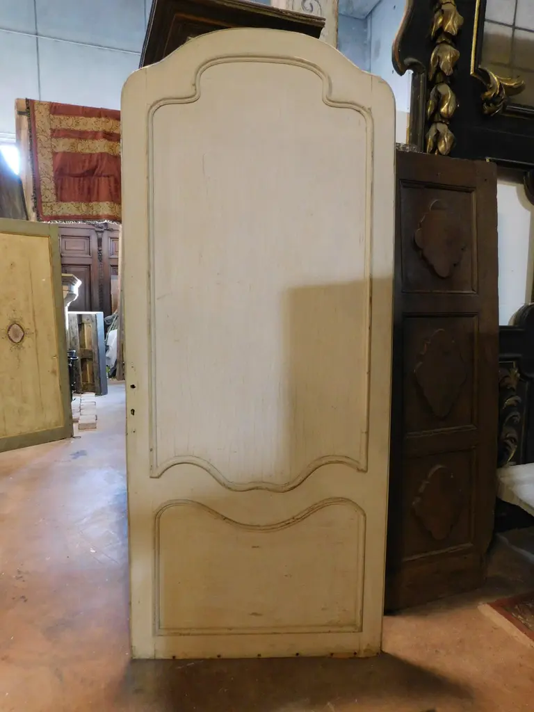 set of 2 antique white lacquered interior doors, with curved single-leaf shape, complete with lacquered frame with golden moldings, made for a noble palace in Italy (Rome) in the 19th century, white lacquered back, pull opening: one to the right and the other left, maximum dimensions cm w 128 x H 252, internal light measurement cm w 100 x H 240