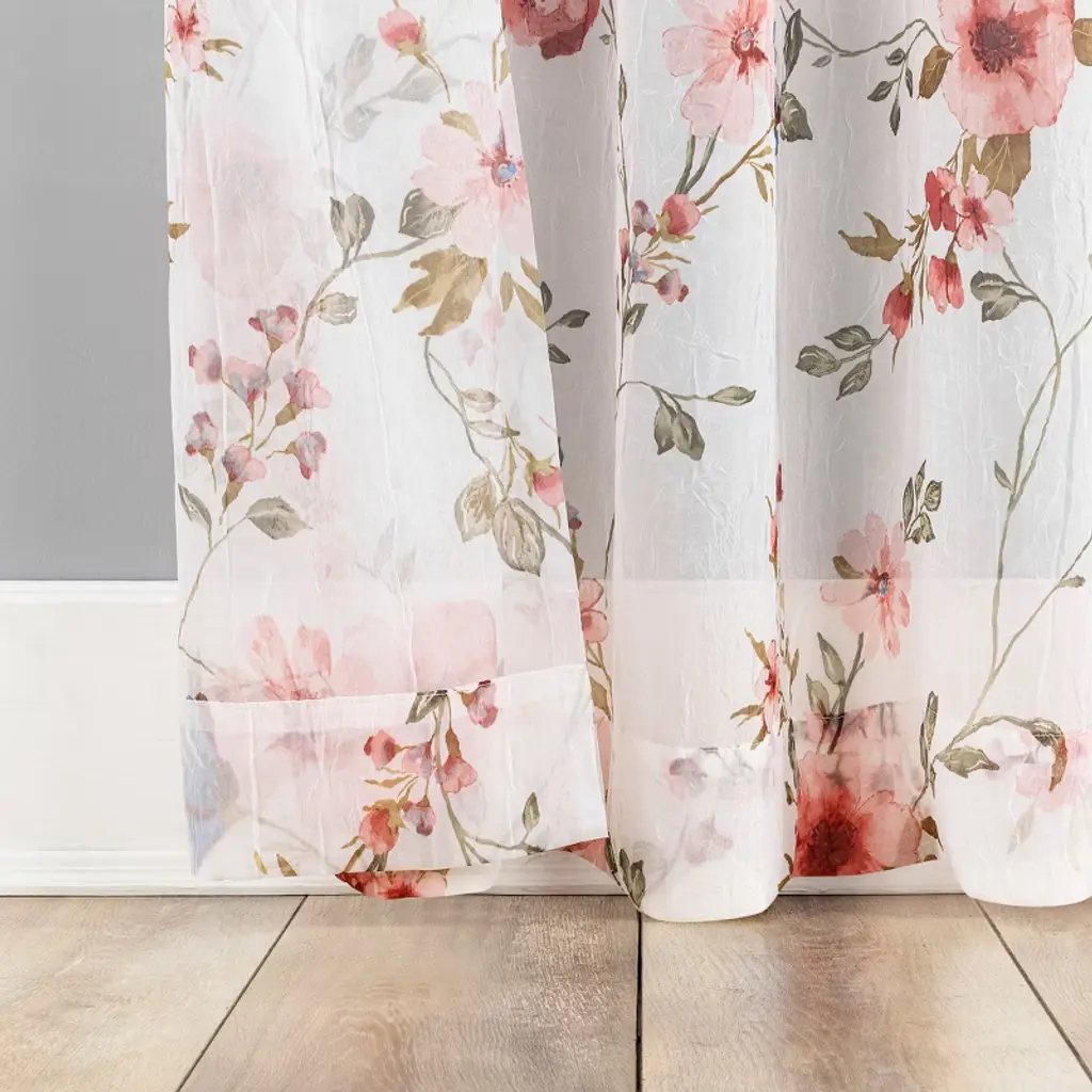 Add whimsical charm to any room of your home with the floral print design of Jocelyn Curtain Panels by No. 918. Delicately crushed voile fabric gently filters light while enhancing privacy. Built-in rod pocket fits curtain rods up to 1.5" in diameter. Machine washable. Panels sold individually. Measure carefully prior to purchase (Image features 2 panels). Sold as individual panels measuring 51" width by 63" length in color coral. Measure carefully before selecting your desired size and quantity. Rod not included. Machine wash warm on gentle cycle. Use only non-chlorine bleach when needed. Tumble dry low heat. Do not iron.