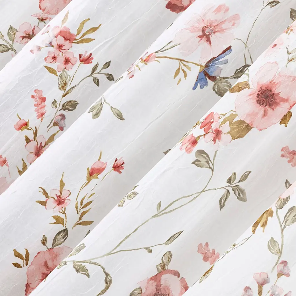 Add whimsical charm to any room of your home with the floral print design of Jocelyn Curtain Panels by No. 918. Delicately crushed voile fabric gently filters light while enhancing privacy. Built-in rod pocket fits curtain rods up to 1.5" in diameter. Machine washable. Panels sold individually. Measure carefully prior to purchase (Image features 2 panels). Sold as individual panels measuring 51" width by 84" length in color coral. Measure carefully before selecting your desired size and quantity. Rod not included. Machine wash warm on gentle cycle. Use only non-chlorine bleach when needed. Tumble dry low heat. Do not iron.