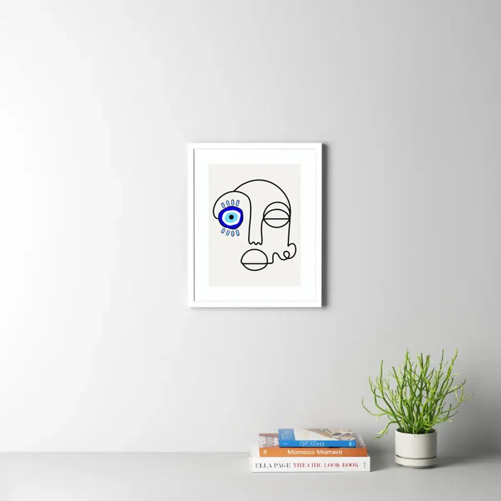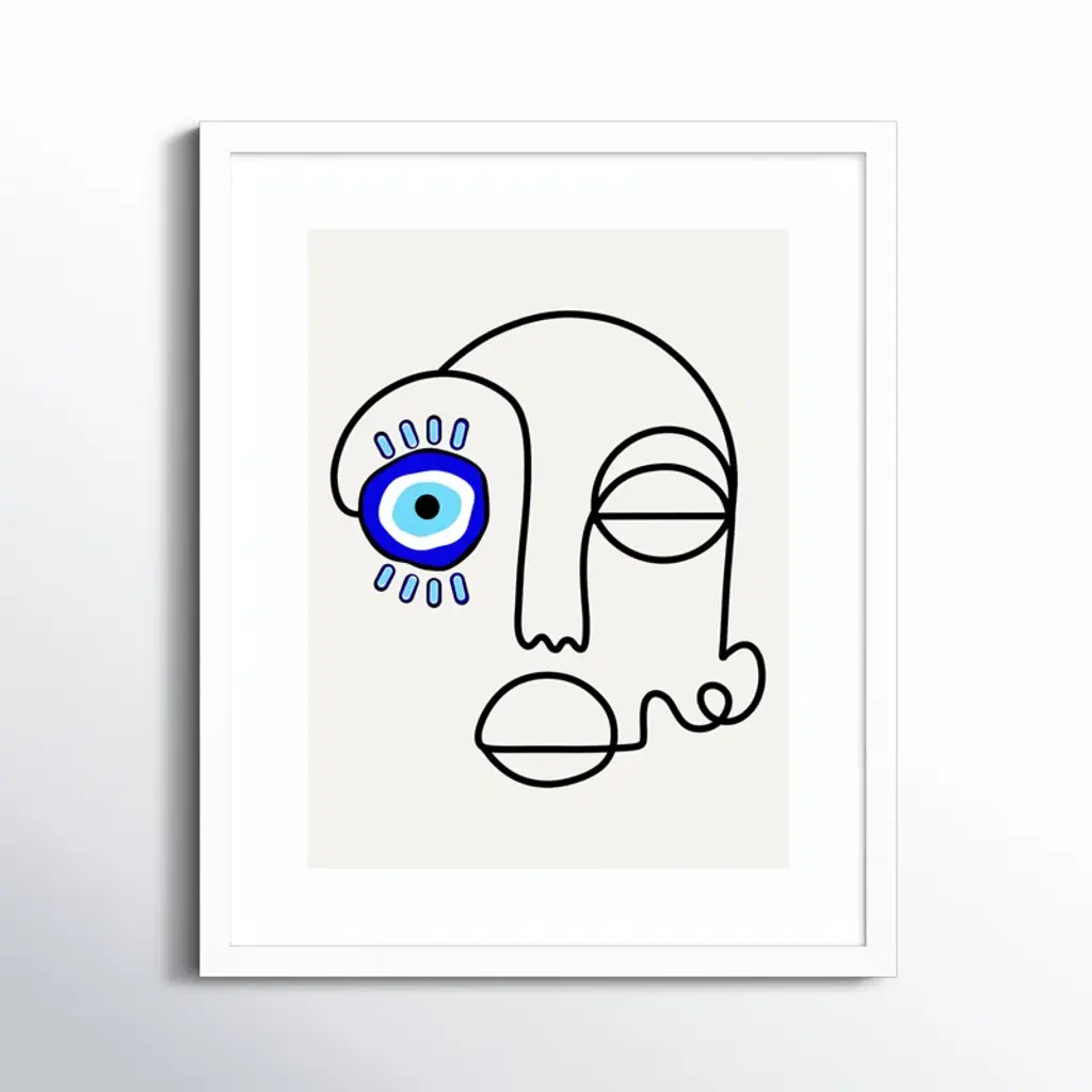 This graphic art print draws on a classic symbol of protection, and layers it into an abstract design for a playful modern look. Printed in the USA, this piece by artist Shatha Al Dafai features a reproduction of the blue "evil eye" design that forms the right eye of a minimalist take on a face. This piece is giclee-printed on paper with an accurate reproduction. It arrives framed and covered with acrylic glass that helps protect the image from fading. Wall mounting hardware is included, so it's ready to hang right out of the box.