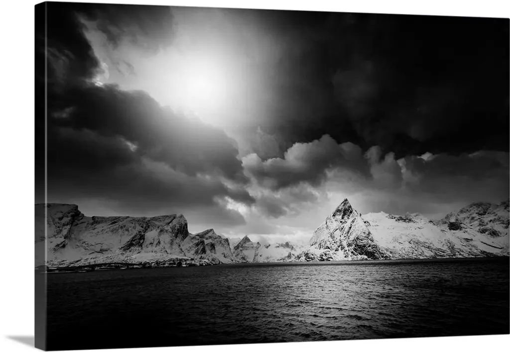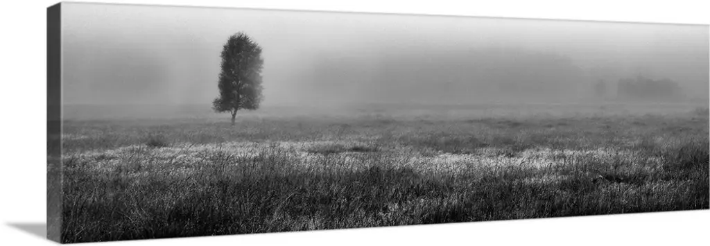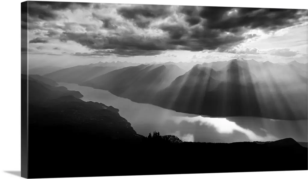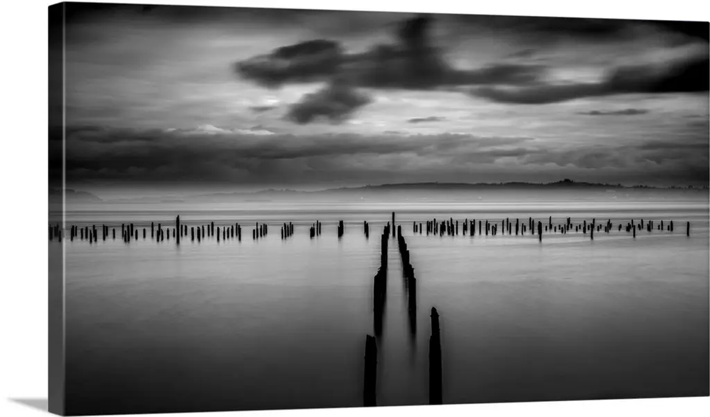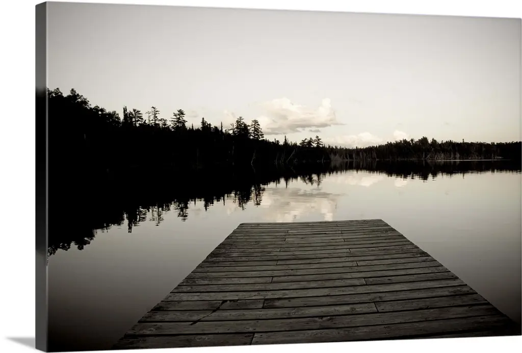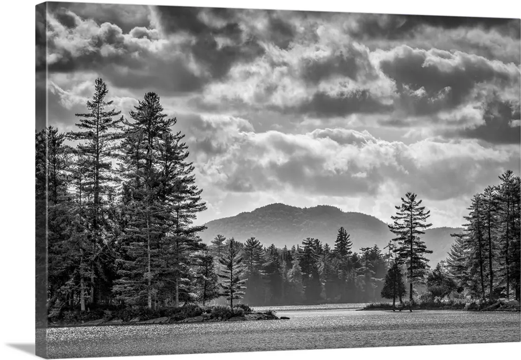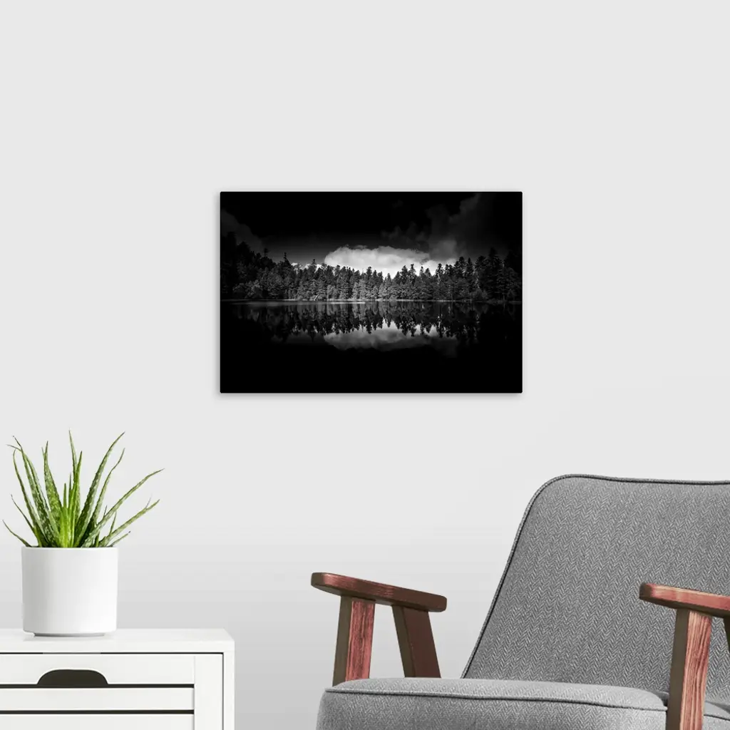 Black and white photograph of a row of reflecting trees onto a still lake with high contrasting clouds above.