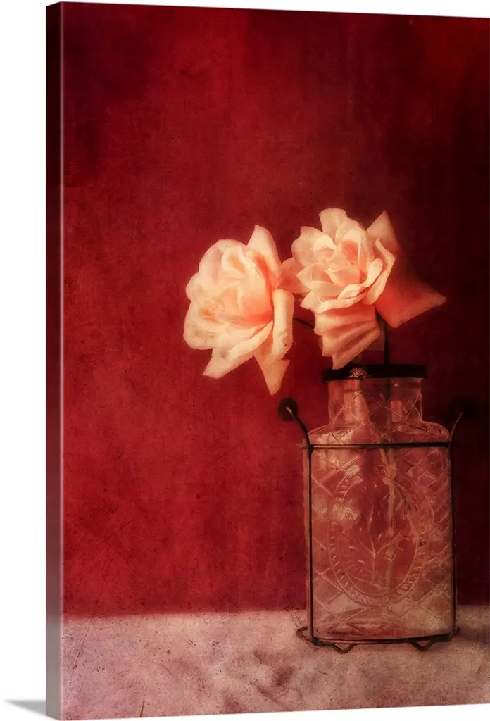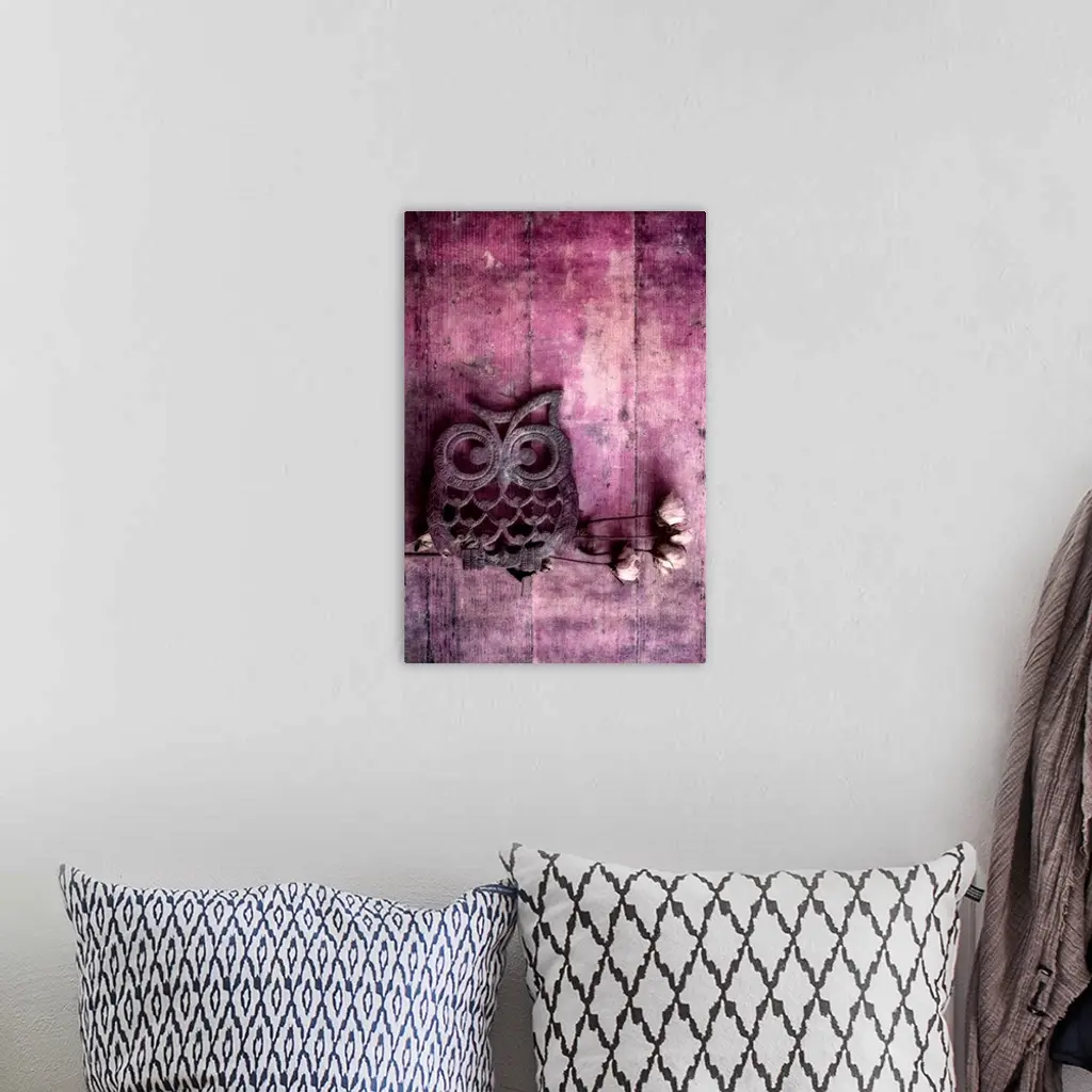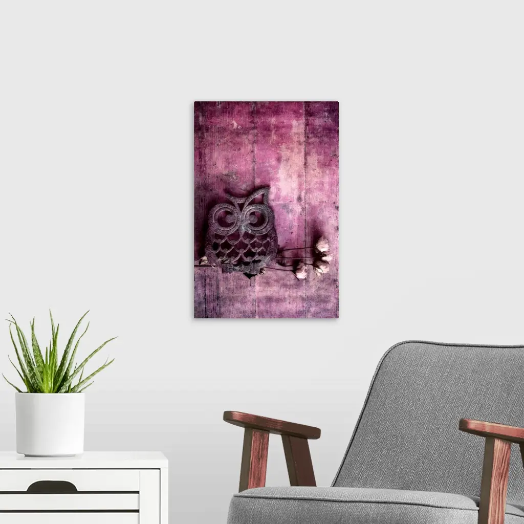 Old, rusty and damaged metallic eared owl, sitting on roses