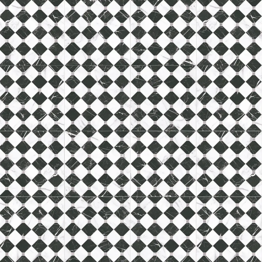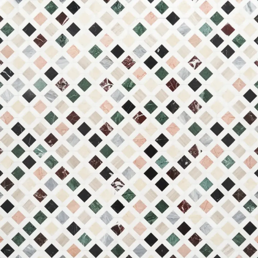 Inspired by the lively murals and bold colors of New Orleans, this merges the old with the new, blending a Victorian-Esque diamond-shaped pattern and a varied mixture of jewel-toned marbles. This polished mosaic is playful and captivating, with each piece acting as its own exquisite work of art, featuring contrasts of black and white, swirls of white and burgundy, and veins of coral and amber. Promised to embellish any space with its whimsical luxe, this can be used both on commercial and residential walls, along with residential floors to create a luxurious look that still knows how to have fun, just like the city that inspired this collection!