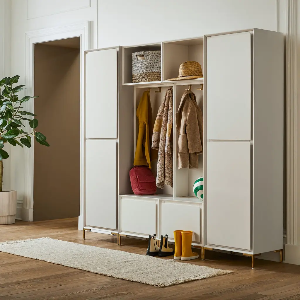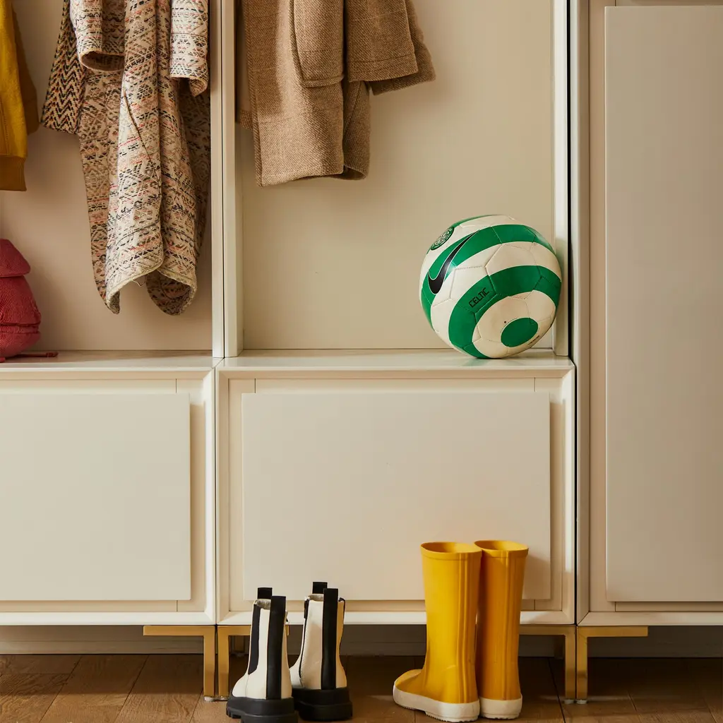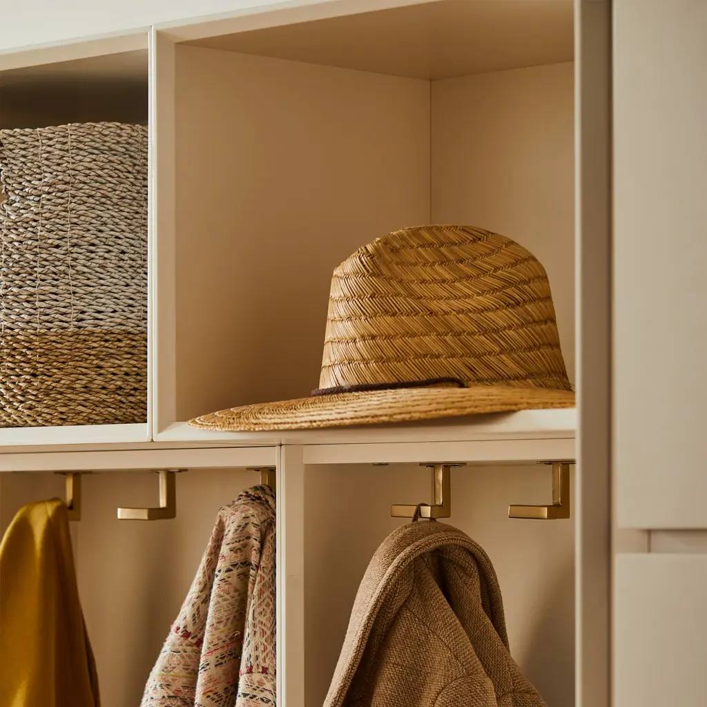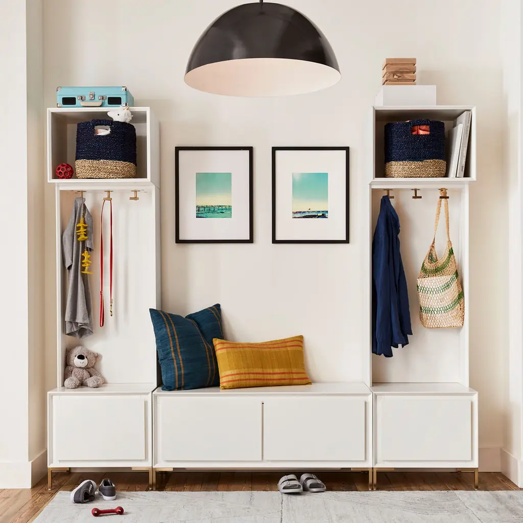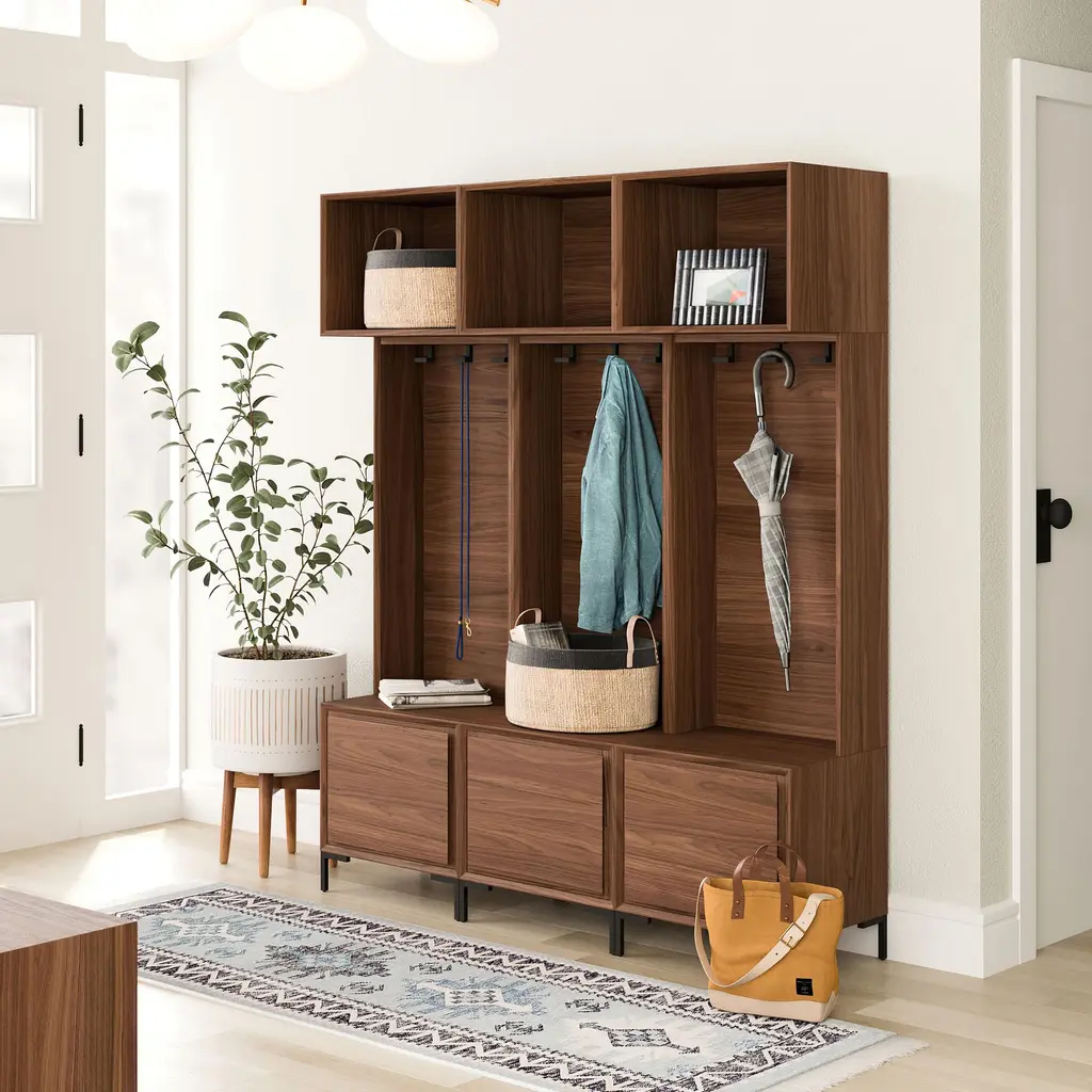 Equipped with three hooks and two cabinets to display (or hide away) your things, this ultra-functional hall tree can be paired with other pieces in the collection to create your ideal storage system.