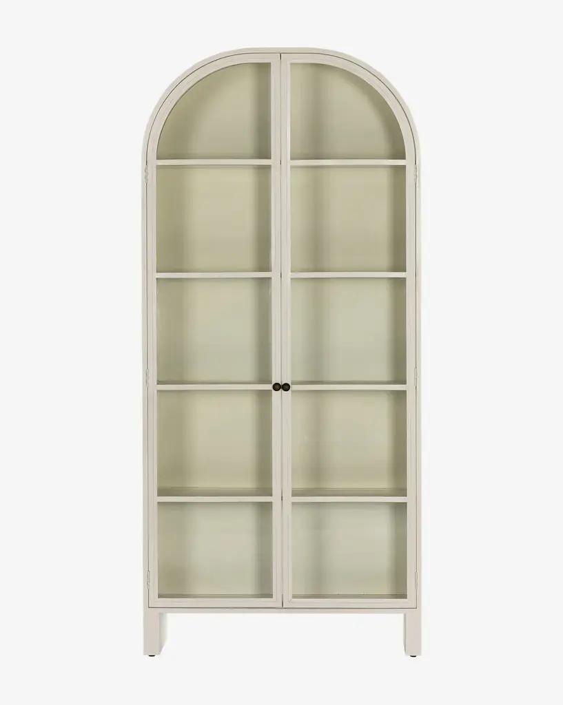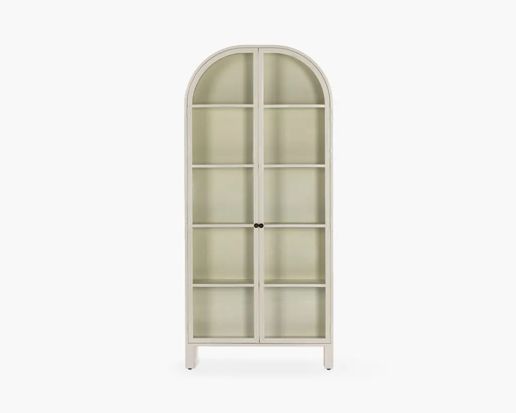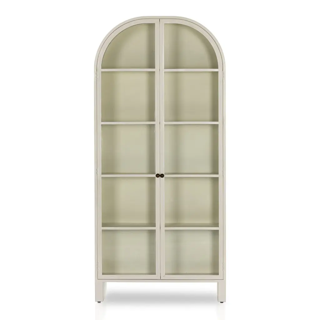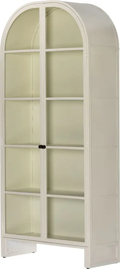 Store it in style. Made from cream powder-coated iron, beautifully arched cabinetry features glass-front doors, ideal for storing and displaying favorite books, photos, keepsakes, and more. 40" W x 16" D x 87" H Shipping box: 44" W x 20.5" D x 96" H, 288lbs. No assembly required Receives White Glove delivery