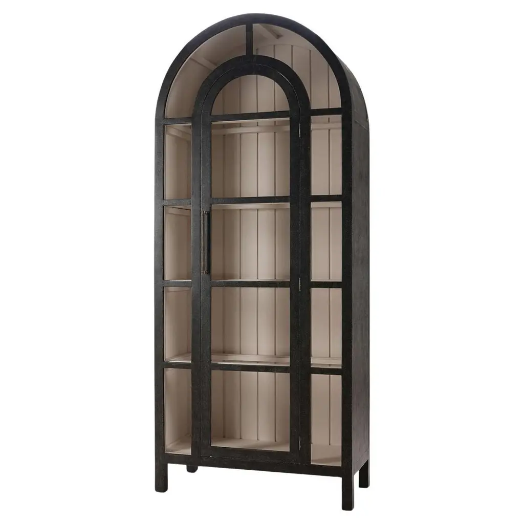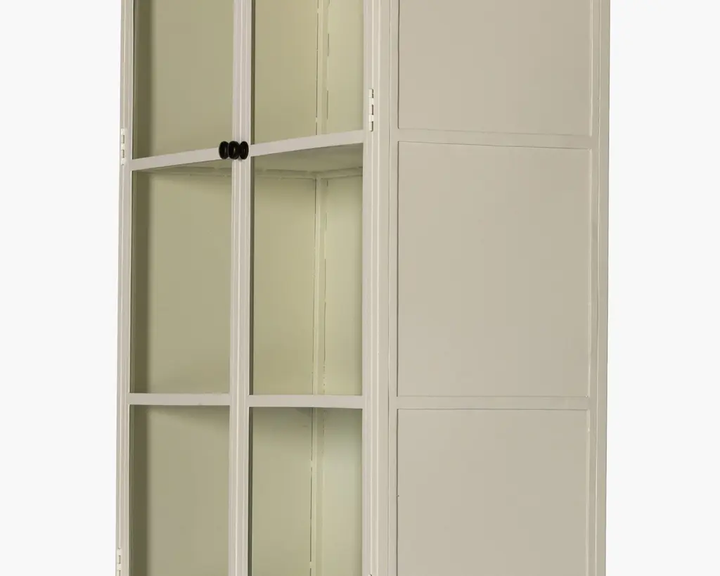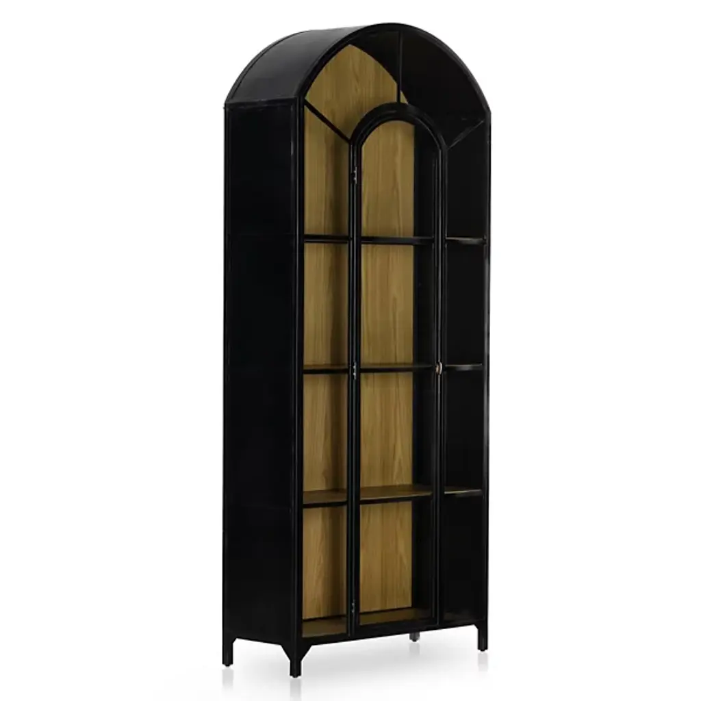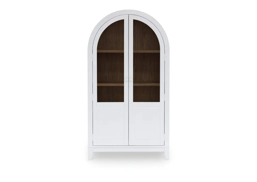 Store it in style. Made from cream powder-coated iron, beautifully arched cabinetry features glass-front doors, ideal for storing and displaying favorite books, photos, keepsakes, and more. 40" W x 16" D x 87" H Shipping box: 44" W x 20.5" D x 96" H, 288lbs. No assembly required Receives White Glove delivery