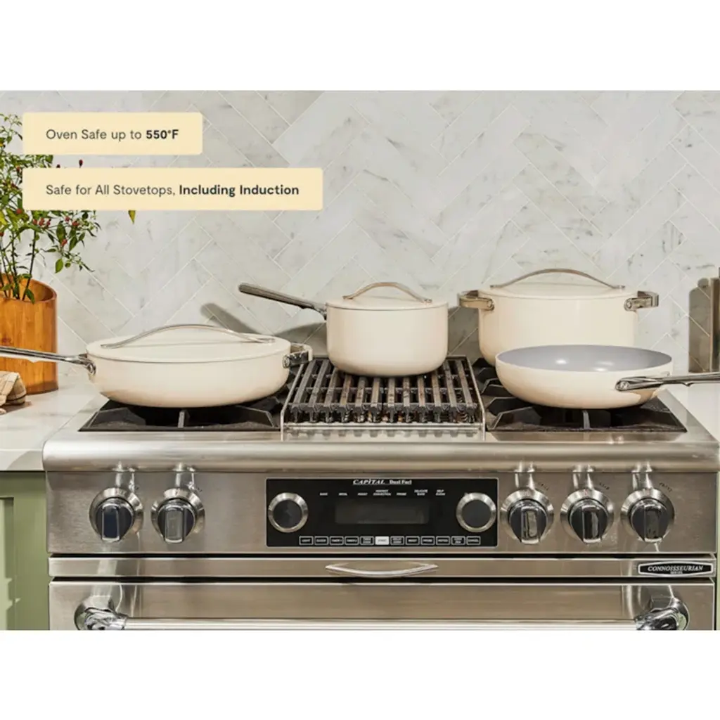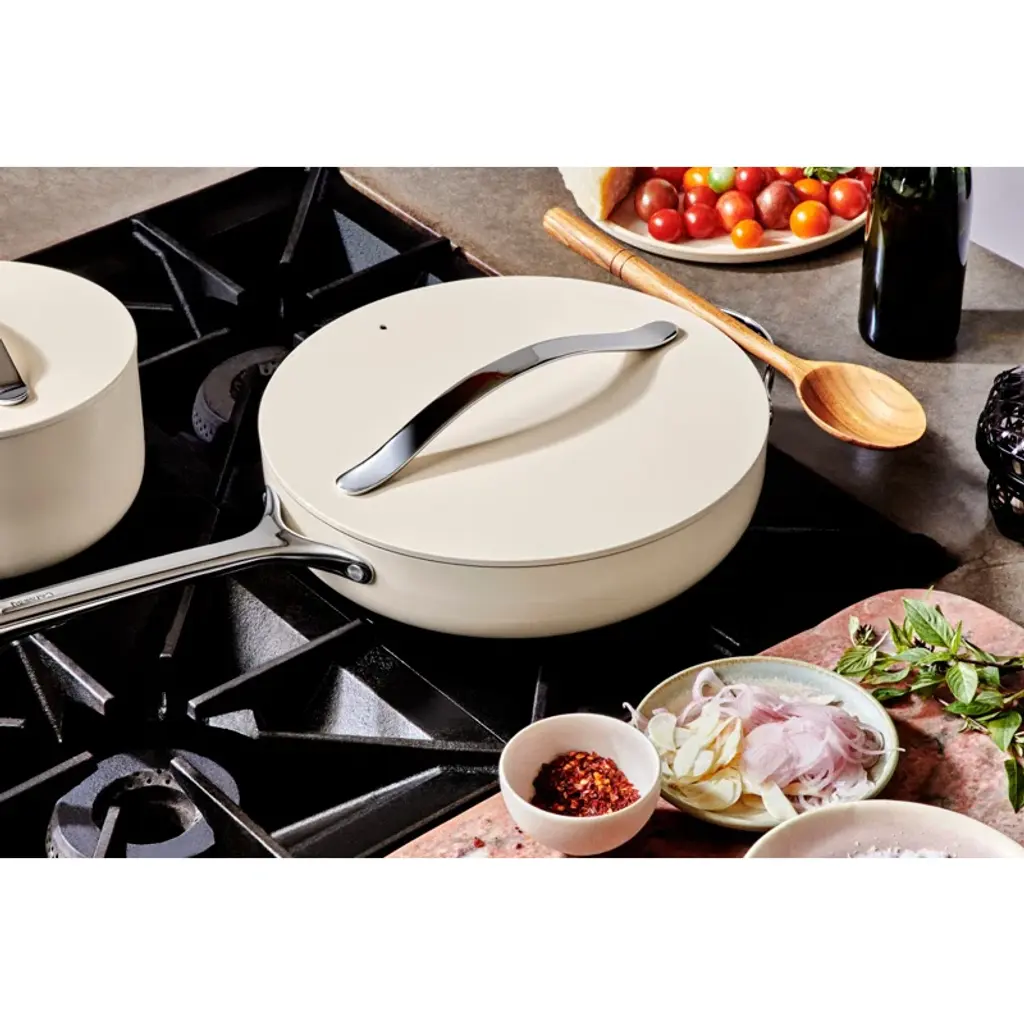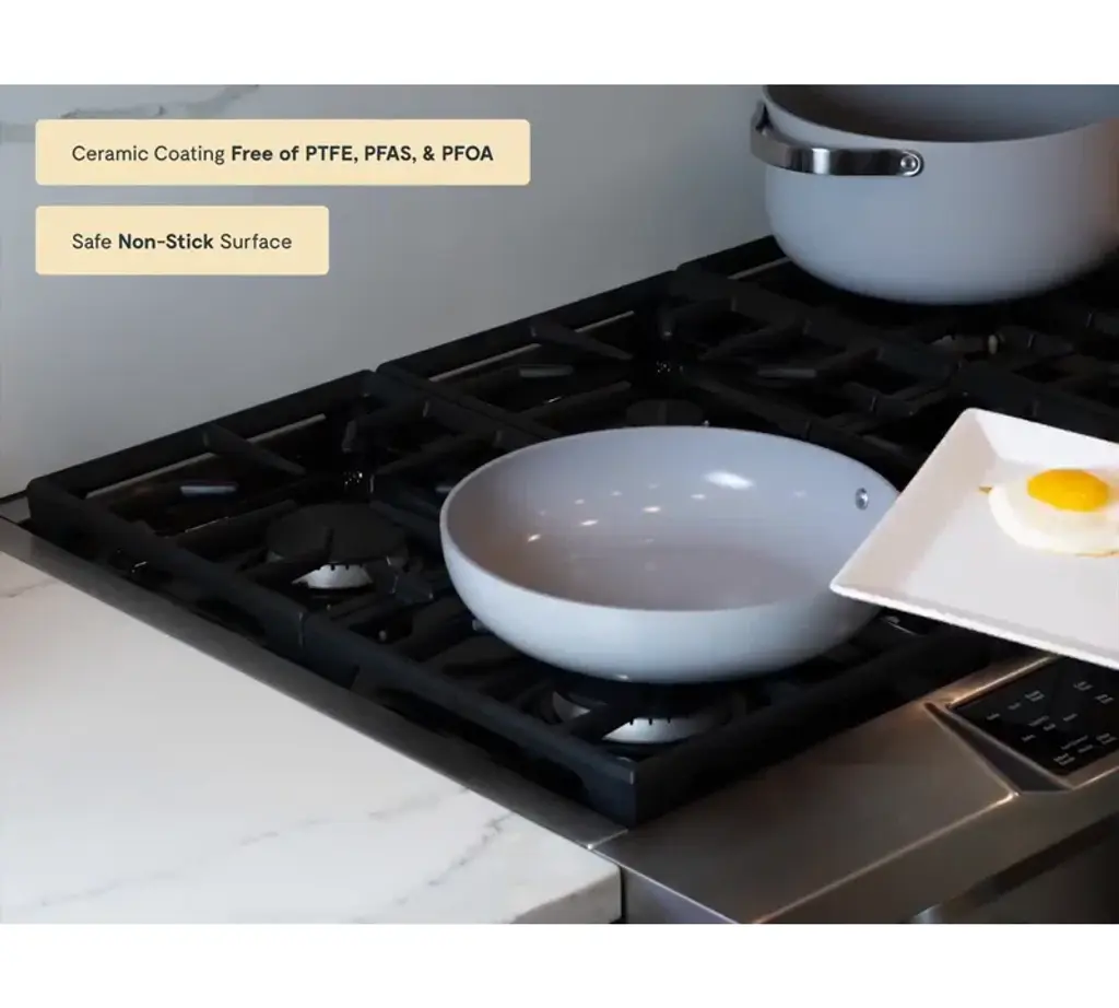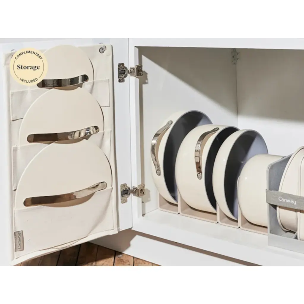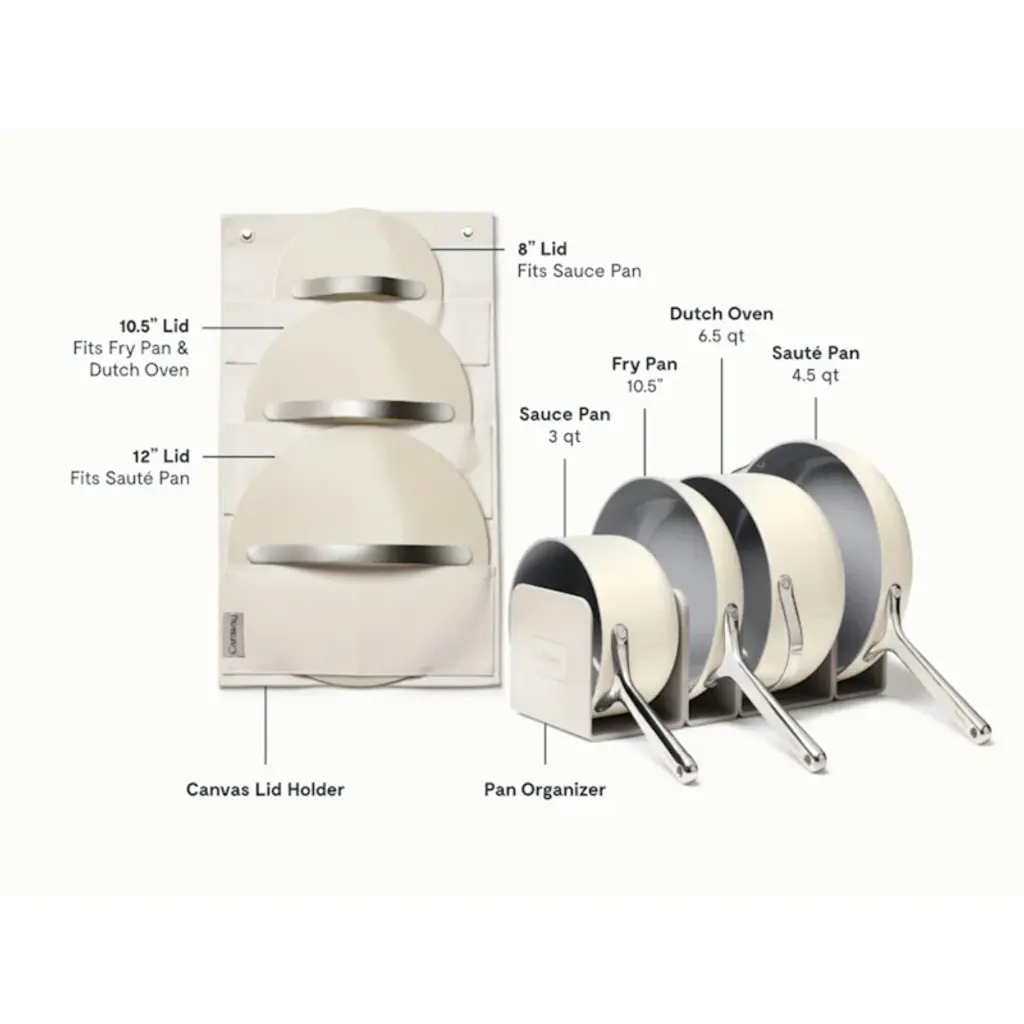 Ditch the chemicals with Caraway's ceramic-coated cookware. Our complete set has everything you'll need for healthy cooking in your kitchen, staying organized with both our pot and lid holders, and looking good while doing so.