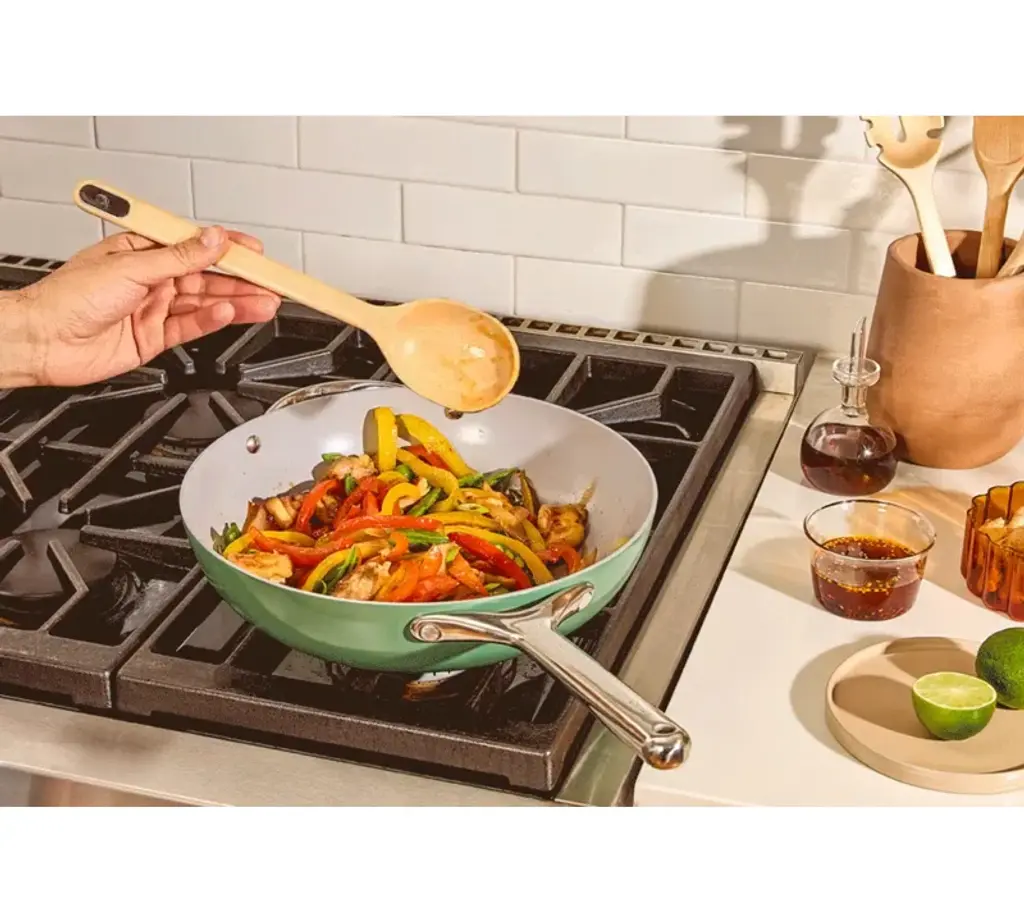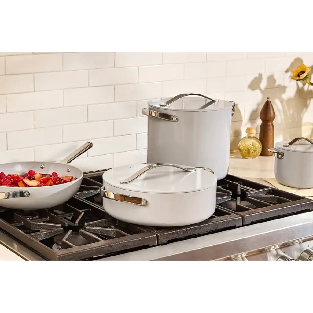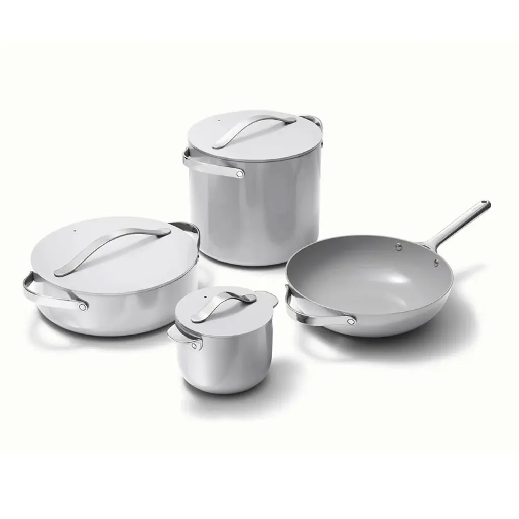 Meet Caraway's extended Cookware family: 4 pans in new shapes and sizes for added precision and possibilities. You'll have the right tools for the job — big or small — like steaming rice, stir frying dinner, or making a batch of soup to last a week. This first-of-its-kind set is designed with the same elements as our best-selling Cookware Set, including a non-stick and non-toxic ceramic coating and a custom storage solution. Good taste runs in the family.