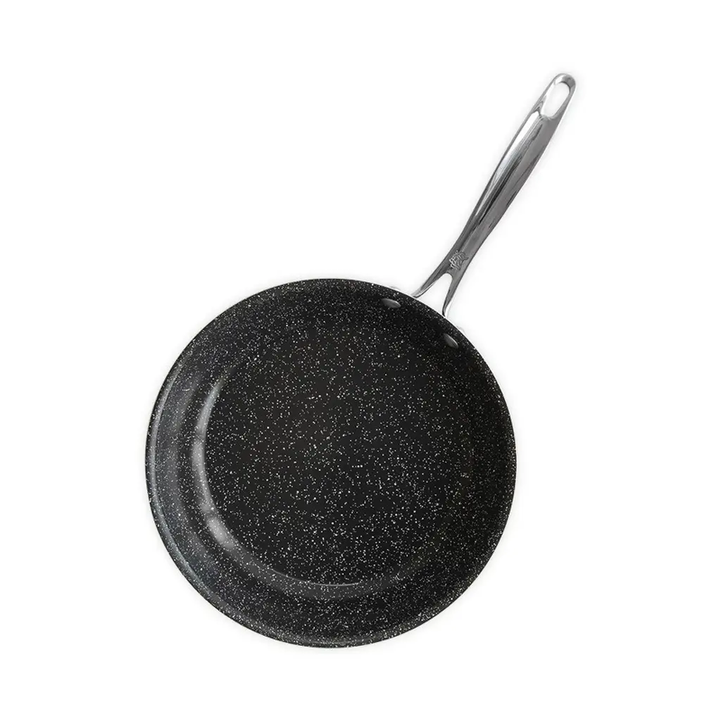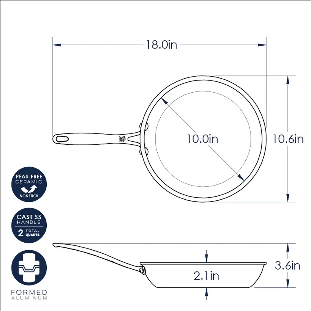 Our new restaurant-quality cookware includes the ceramic 10" Saute Skillet - this skillet is engineered from professional-grade aluminum to guarantee rapid and even heating, ensuring culinary excellence with every use.Indulge in the comfort of an alternative to traditional nonstick cooking, thanks to the Swiss-made 3-layer ceramic nonstick coating. Its exceptional design allows you to cook with minimal oil, preserving the integrity of your ingredients and delivering a culinary experience like no other.The skillet's durable construction and nonstick coating ensures it will last a long time, making cleaning a breeze as the ceramic nonstick surface ensures quick release. Plus its perfect for both stovetop and oven use, up to 400°F/204°C. Upgrade your cookware game with this versatile and high-performing skillet today. Proudly made in the USA..