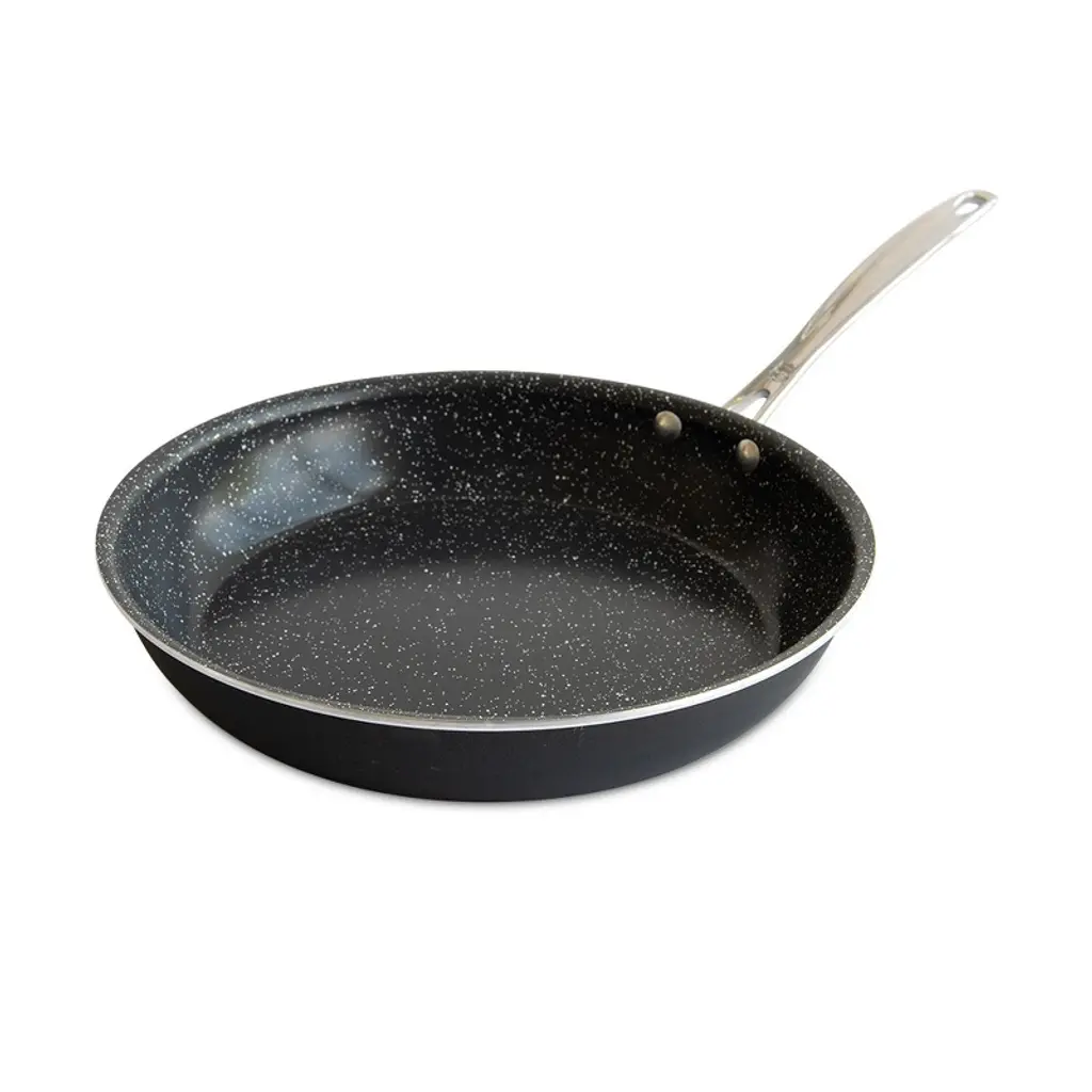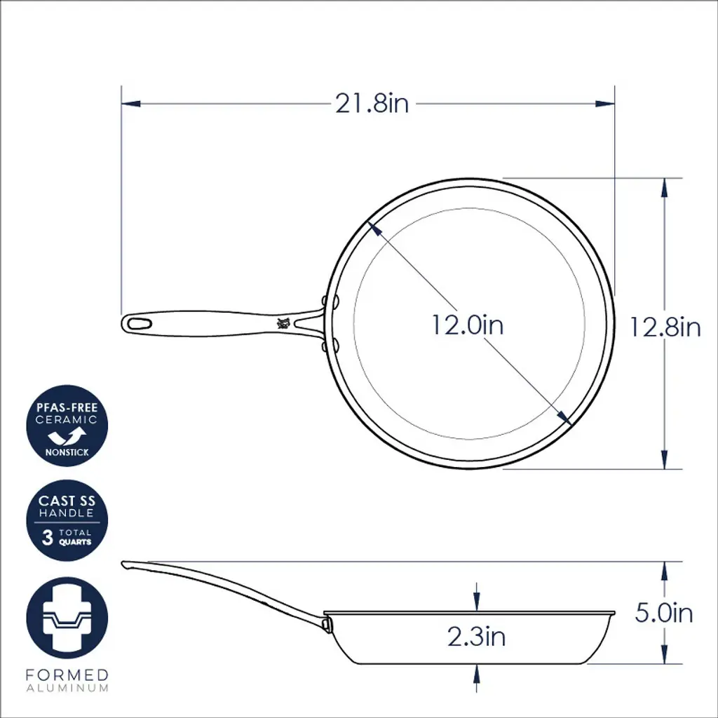 Introducing the Basalt 2 Piece 12" Sauté Pan & Lid – the ultimate fusion of style, functionality, and performance. Crafted from premium aluminum, this beautifully designed cookware guarantees even, quick heating for perfectly cooked meals every time. Proudly made in America,Experience the luxury of our premium ceramic coating that not only enhances your cooking but also makes cleanup effortless. The cast stainless handle stays comfortably cool on any stovetop – whether gas, electric, or glass – and seamlessly transitions into the oven to finish off your culinary masterpieces. The universal stainless steel lid features a sturdy cast knob for a secure grip and is both stovetop and oven-safe, making it versatile for all your cooking needs. Elevate your kitchen with cookware that combines elegance and top-notch performance. Set includes - 12" Sauté Pan & Lid