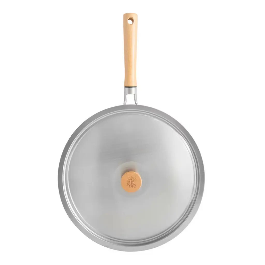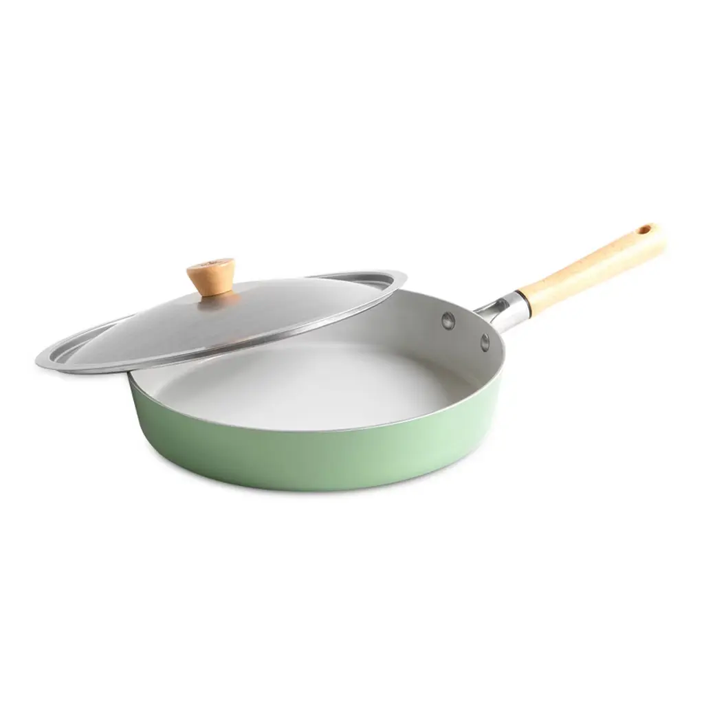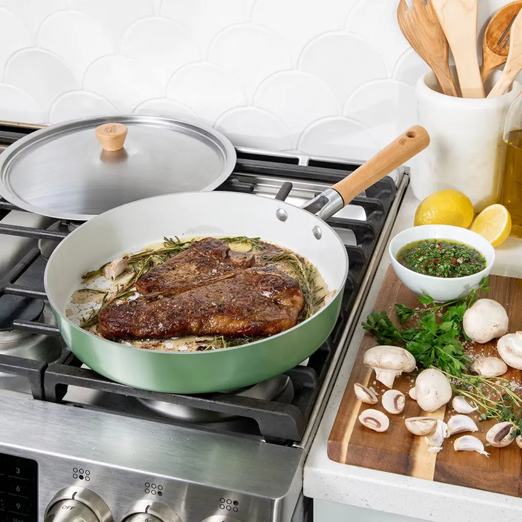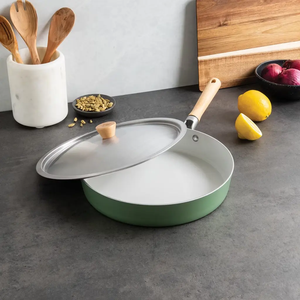 Designed for family meals and bold flavors, the Cardamom™ 12" Fry Pan with Lid offers a perfect blend of performance and elegance. Its spacious, spun aluminum base heats quickly and evenly, while the ceramic nonstick interior delivers effortless food release and easy cleanup—without the need for excess oil. Paired with a matching brushed stainless steel lid, this set locks in heat and moisture for better flavor and fewer splatters. With Scandinavian-inspired wood handle and knob, it’s a beautiful upgrade for any stovetop. The fry pan is compatible with gas, electric, and ceramic stovetops. Set Includes: 12 Inch Ceramic Nonstick Frying Pan + 12 Inch Stainless Steel Lid..