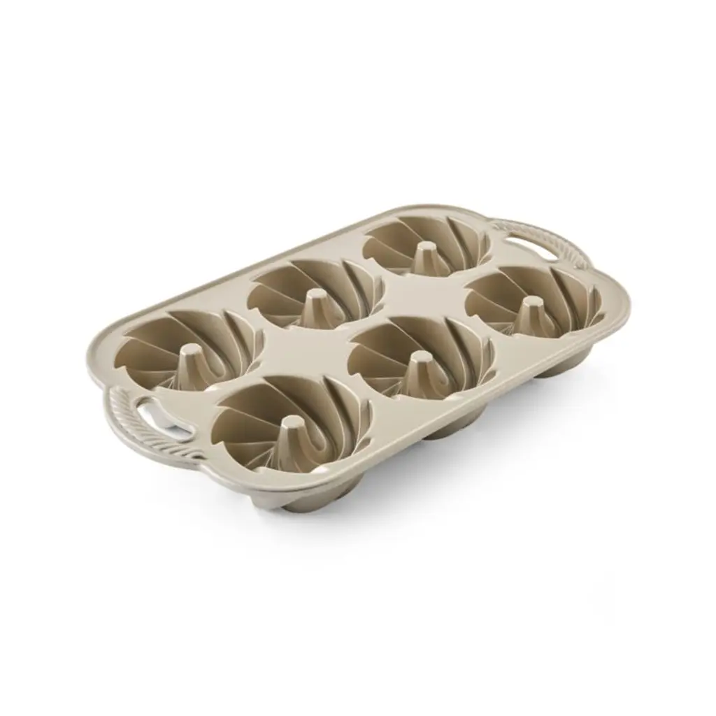 Create cakes worthy of celebration with this set of six diminutive Bundt cake molds, featuring a distinctive swirl that makes cakes beautiful. Bring drama to the next brunch, tea party or birthday with petite yet impressive cakes. At a fraction of the size of classic Bundt pans, these miniature molds bake up mini masterpieces. Cast aluminum conducts heat evenly and keeps details sharp, while the reflective exterior ensures uniform browning. With sturdy handles for easy lifting and inverting and a non-stick interior for perfect release, this baking pan makes Bundts a breeze.Nordic Ware, a family-owned and -operated company, has been making high-quality bakeware for over 70 years.View all Nordic Ware products