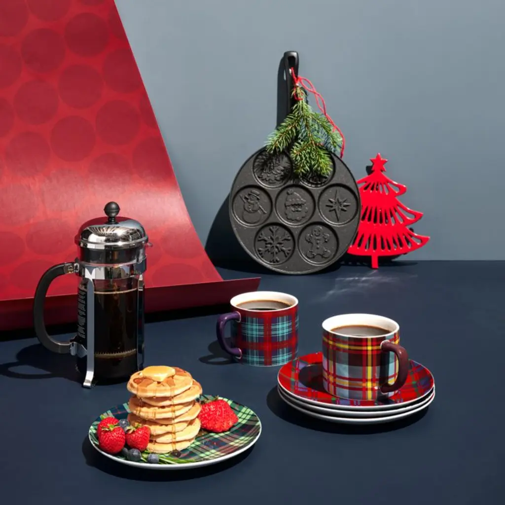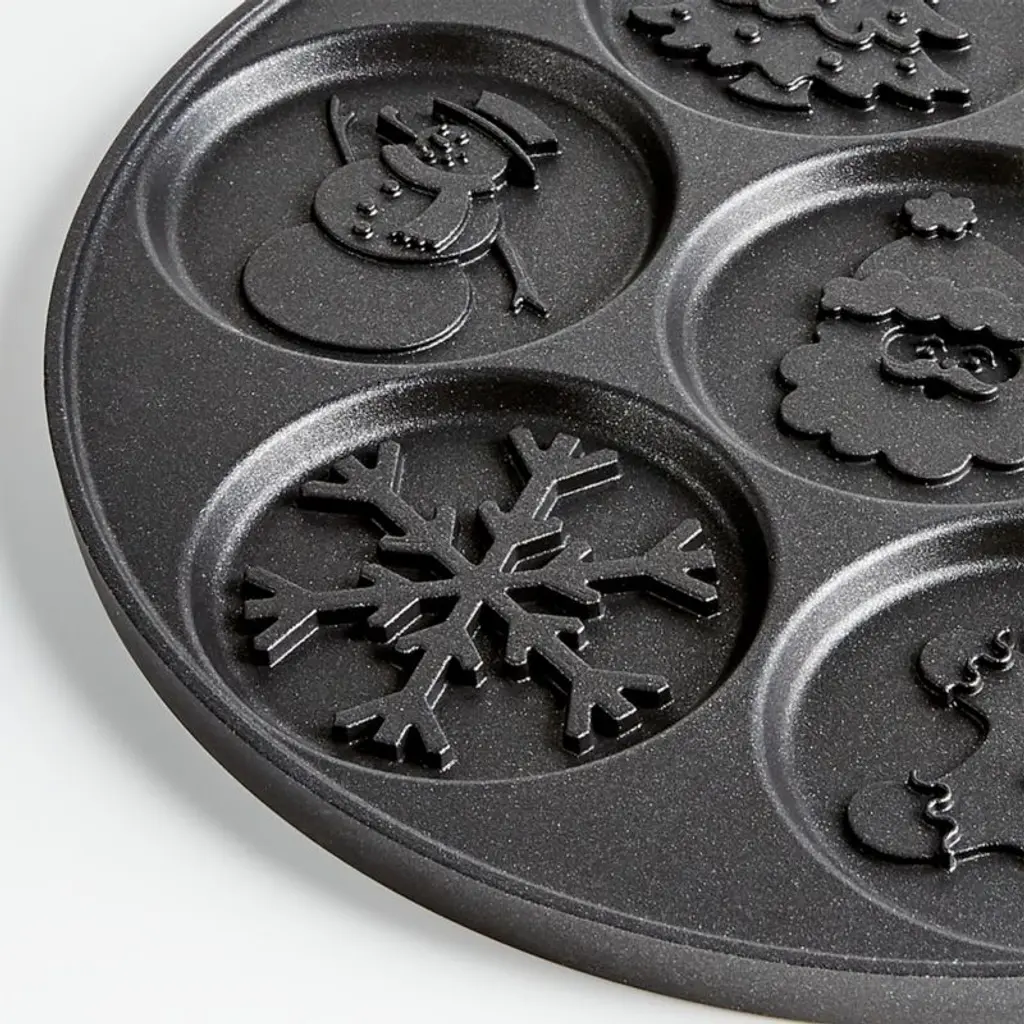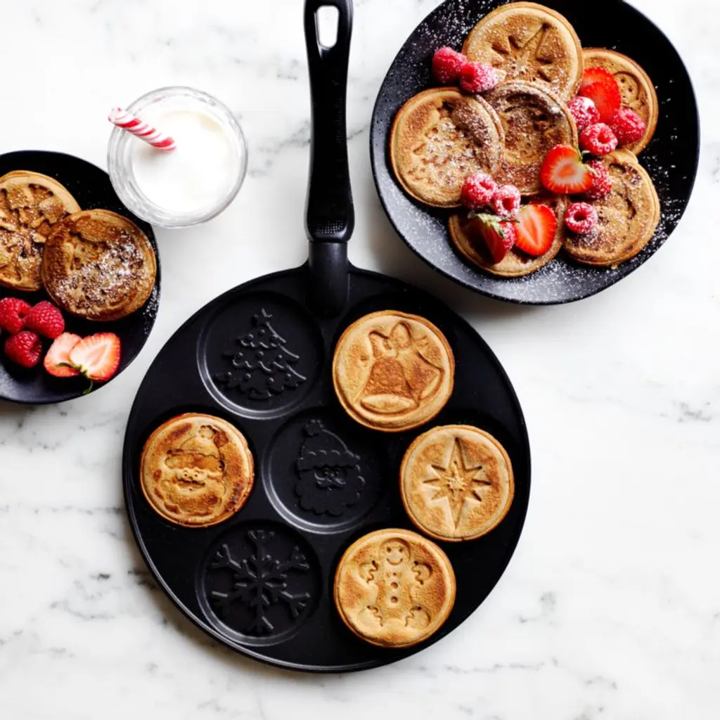 Make Christmas morning extra sweet with this holiday pancake pan. Crafted of sturdy cast aluminum, the clever stovetop pan cooks up seven silver dollar pancakes at the same time, each one embossed with an icon of the holidays: a decorated tree, reindeer, Santa, bell, snowman, angel and star. The non-stick coating ensures easy release and a quick cleanup.Nordic Ware, a family-owned and -operated company, has been making high-quality bakeware for over 70 years
