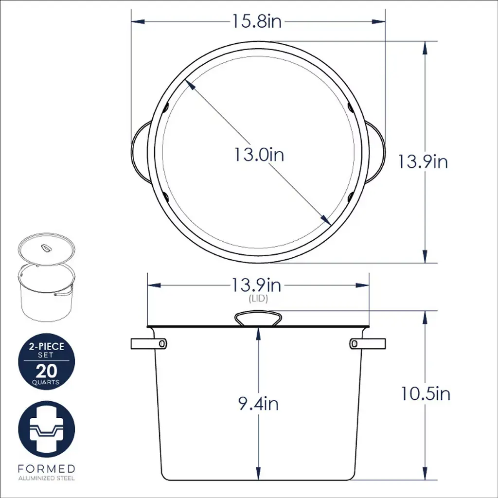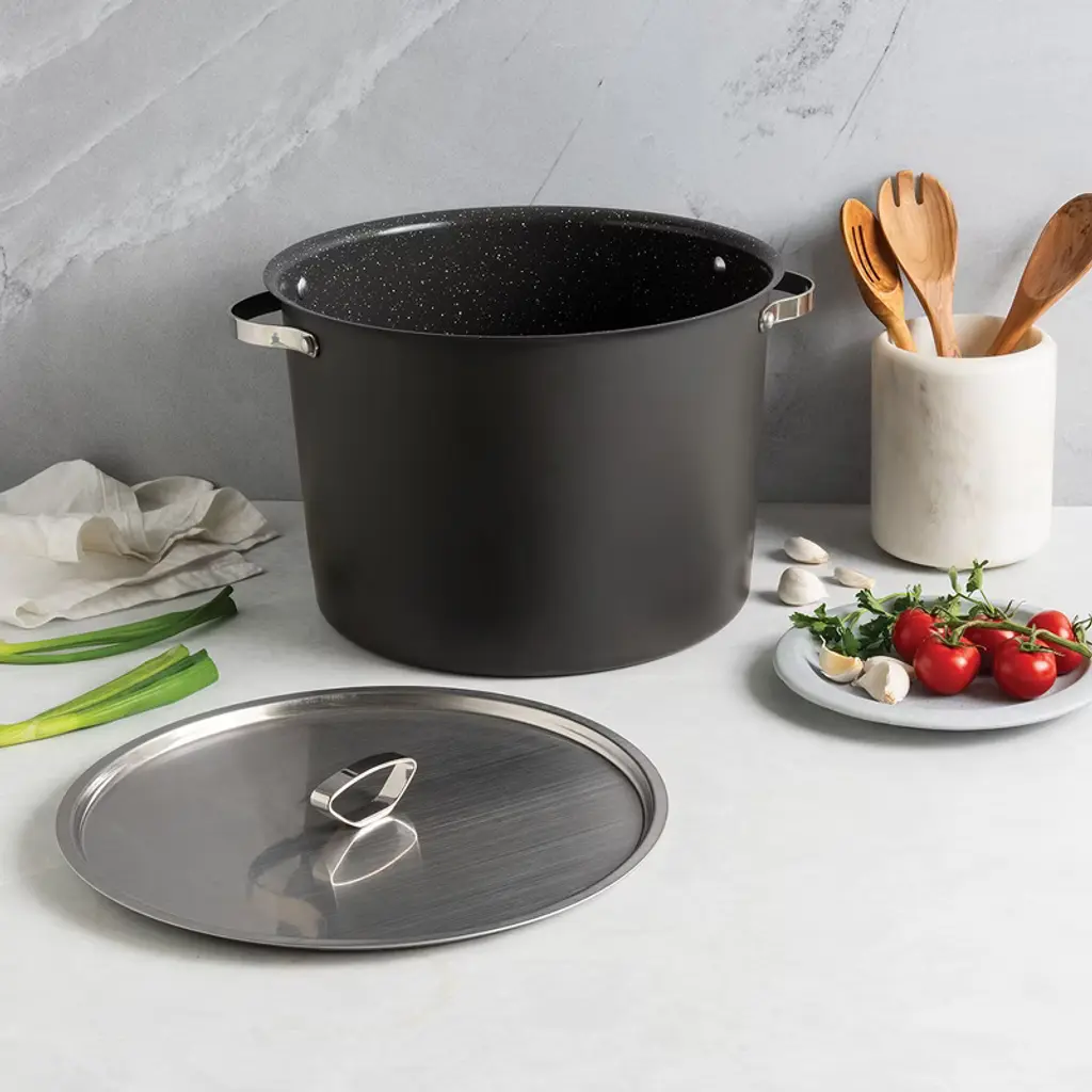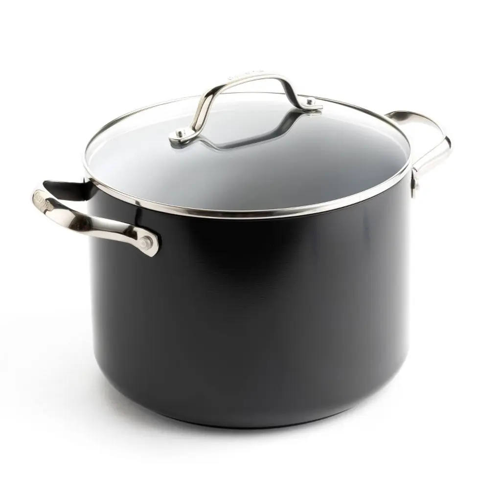 This stock pot is extra-large capacity, nonstick, and built for superior performance. When it comes to big-batch cooking, the Verde 20 Qt Stock Pot with Lid is your go-to kitchen essential. Designed for soups, stews, seafood boils, and more, this extra-large capacity pot is crafted from heavy-duty aluminized steel for durability and coated with a 3-layer ceramic nonstick surface for effortless food release and easy cleanup. moreBuilt for even heat distribution, the induction-compatible base eliminates hot spots for precise cooking. Riveted stainless steel handles with stay-cool silicone grips offer a secure and comfortable hold, even when handling large portions. Oven-safe up to 350°F, this stock pot is as versatile as it is reliable. Paired with a stainless-steel lid, made in the USA, featuring a sturdy imported cast knob for a firm grip, the Verde 20 Qt Stock Pot is perfect for feeding a crowd with ease.