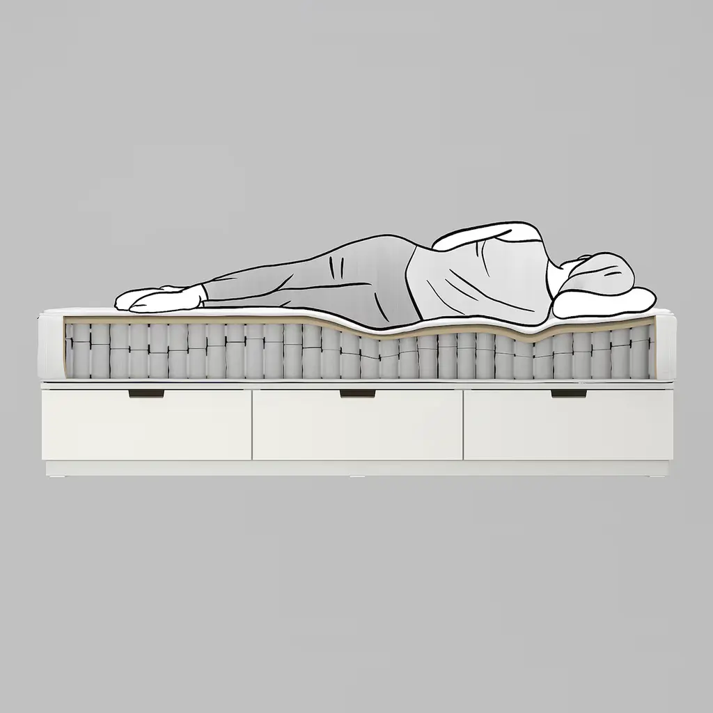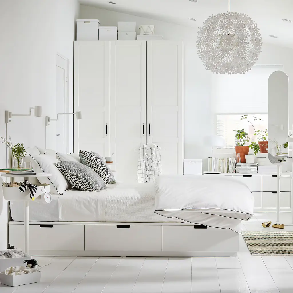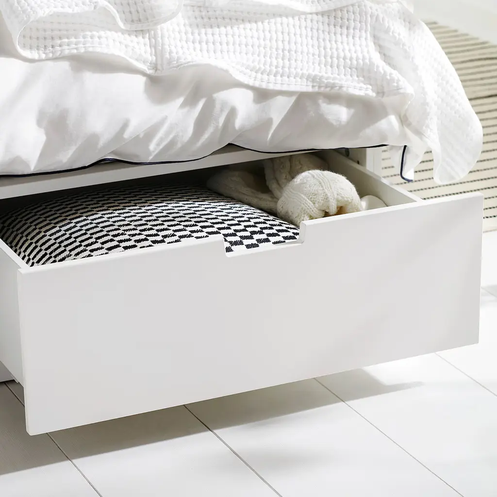 NORDLI Bed frame with storage and mattress - white/Vågstranda medium firm Queen. The compact design is perfect for tight spaces or under low ceilings, so you can make the most of your available space. Soft-closing drawers run smoothly, slowly and silently.