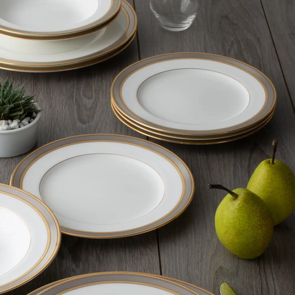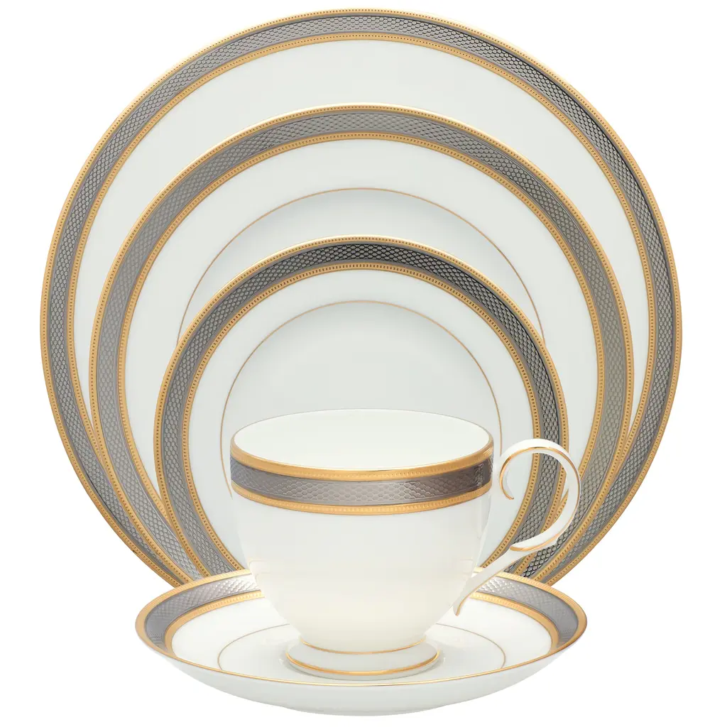 Brilliance features generous applications of etched metal banding. The mixture of gold and platinum bring the versatility of mixed metals to the table. Brilliance is crafted on fine bone china, is suitable for everyday use and is dishwasher safe.