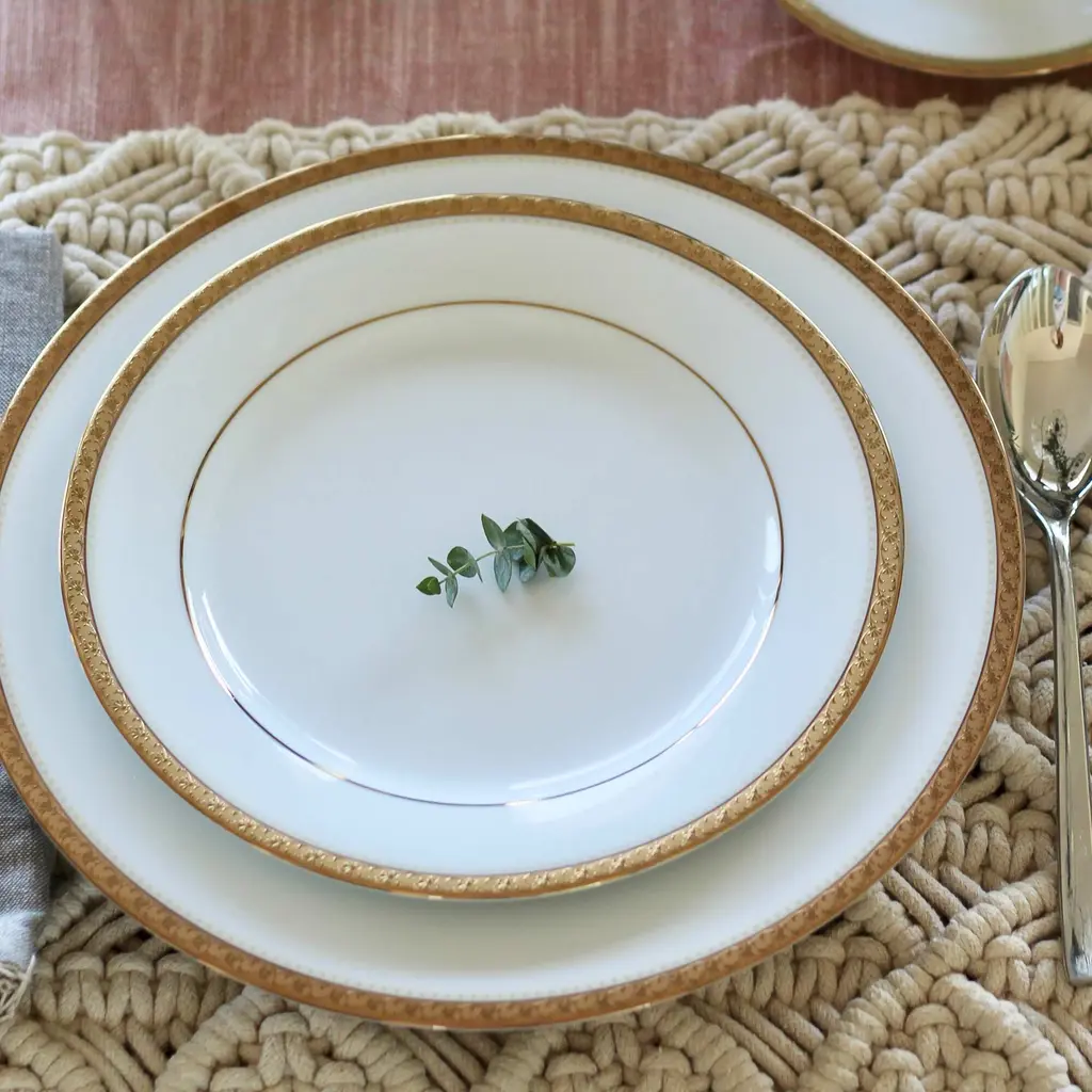 Charlotta is a beautifully classic collection in white porcelain, featuring the modern addition of microwave-safe metal! The prominent gold or platinum banding features flowers and scrolling leaves, perfect for elegant dinners while casual enough for daily use. Charlotta offers place setting components as well as an array of serving pieces and accessories. Charlotta is durable and dishwasher safe!