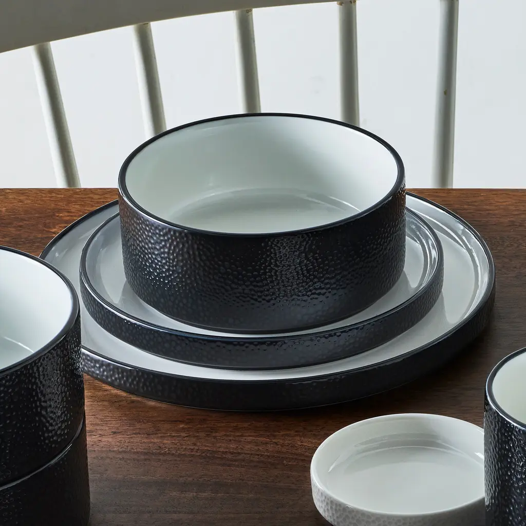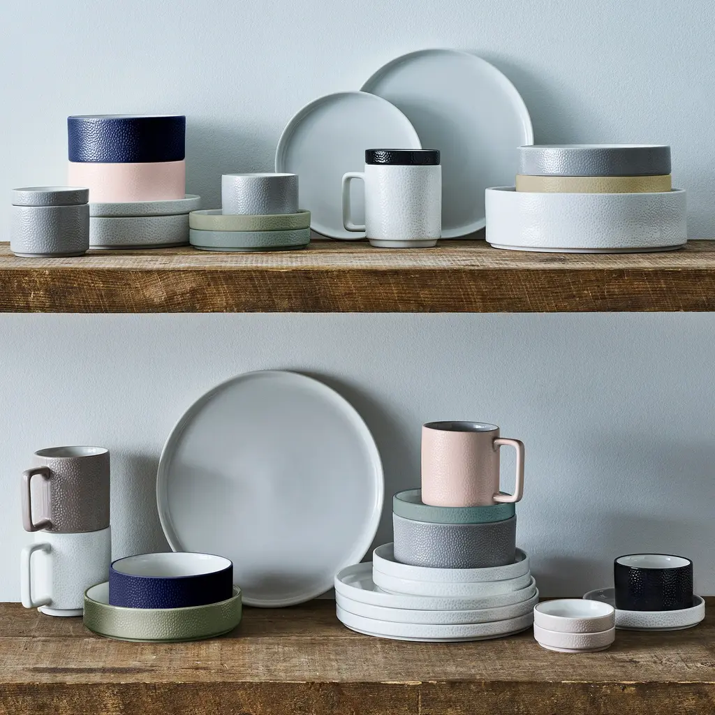 The ColorTex Stone dinnerware collection offers a clean, minimalist look for all of your gatherings. This collection features items that fit together for ultimate functionality and style. ColorTex is microwave and dishwasher-safe. The ColorTex Collection is a distinctly modern grouping of dinnerware, showcasing a glossy pebble texture against a bright glazed interior. The range of colors and items available provide an array of options for the table. The ColorTex dinnerware collection combines modern shapes with a stone texture. The shape is designed for maximum interaction between the pieces, with the plate acting as lids for the bowls the matching sizes.