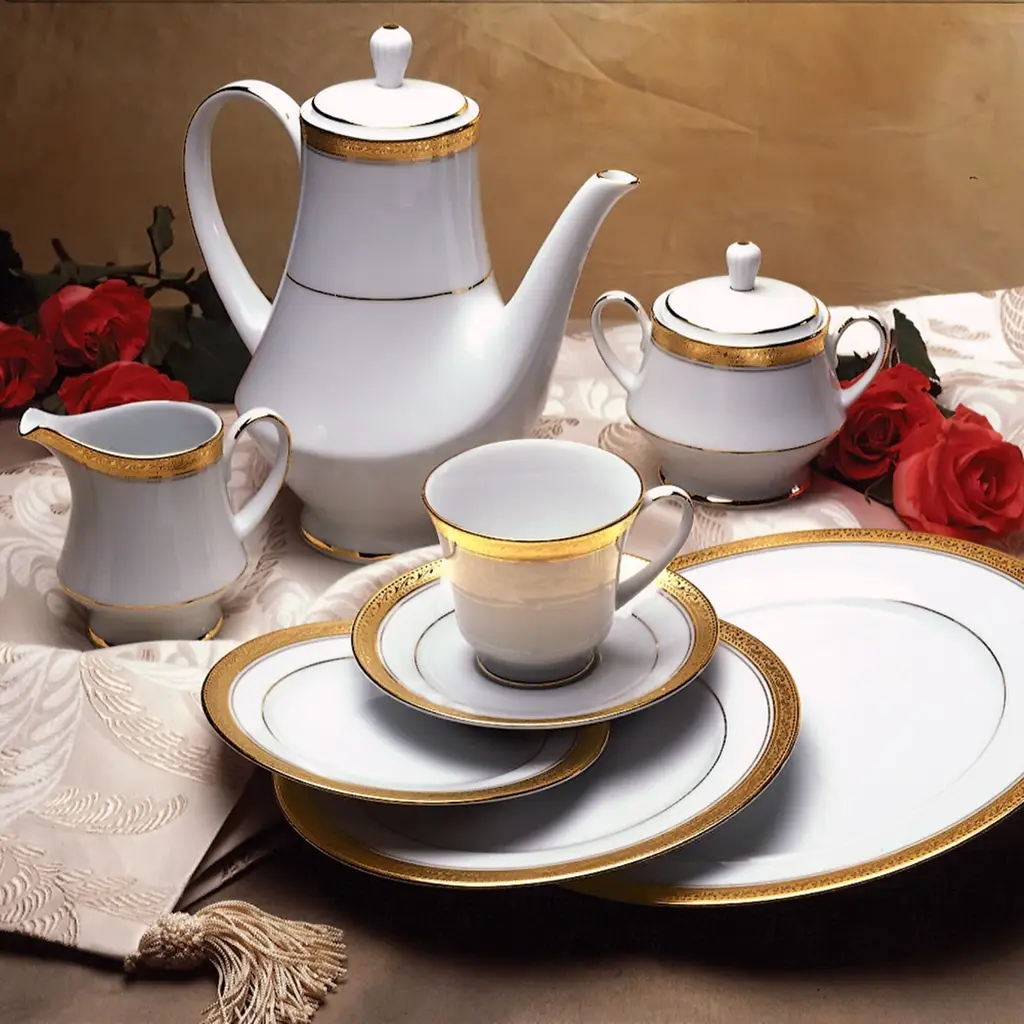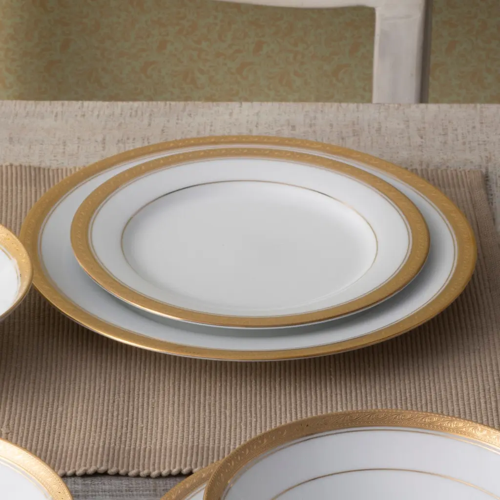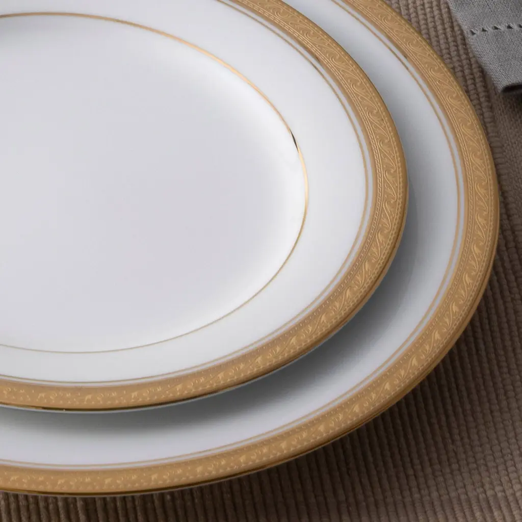 Crestwood brings sophisticated elegance to the table! This stunning pattern features crisp bright white porcelain, paired with a gold or platinum band for a look of elegant simplicity. The exterior gold or platinum band is etched with a design of scrolling leaves. Crestwood offers place setting components as well as an array of serving pieces and accessories. Crestwood is durable enough for daily use and is dishwasher safe!