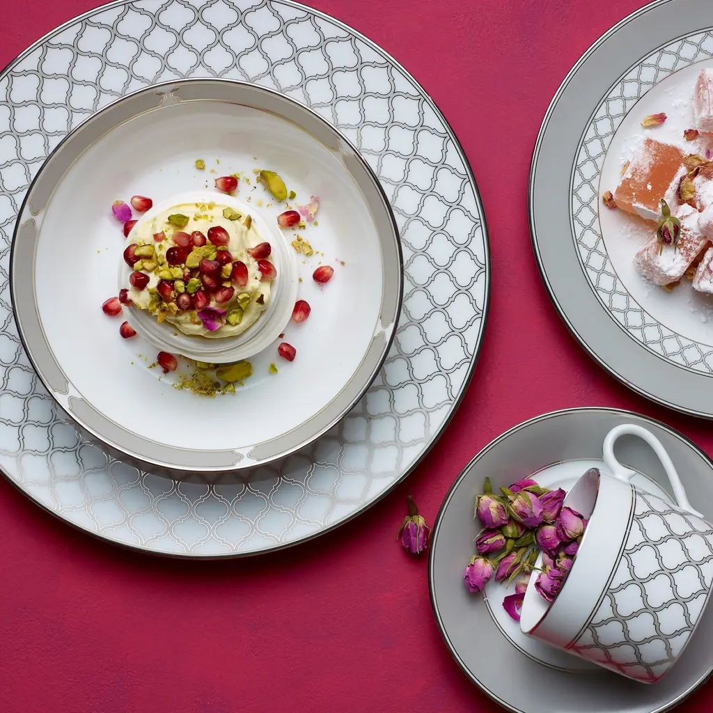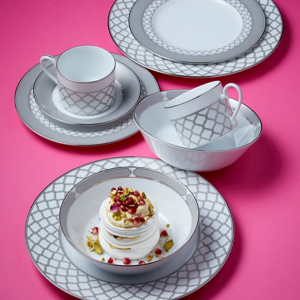 Eternal Palace features an interlocking stylized ogee design, presented in multiple sizes on different pieces for maximum impact. These modern elements are paired with solid presentations of a silvery-grey and classic platinum banding on white porcelain. Eternal Palace is suitable for everyday use and is dishwasher safe!