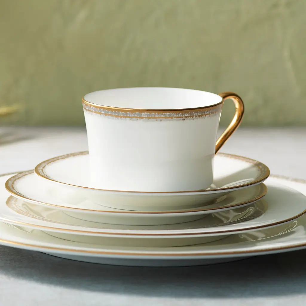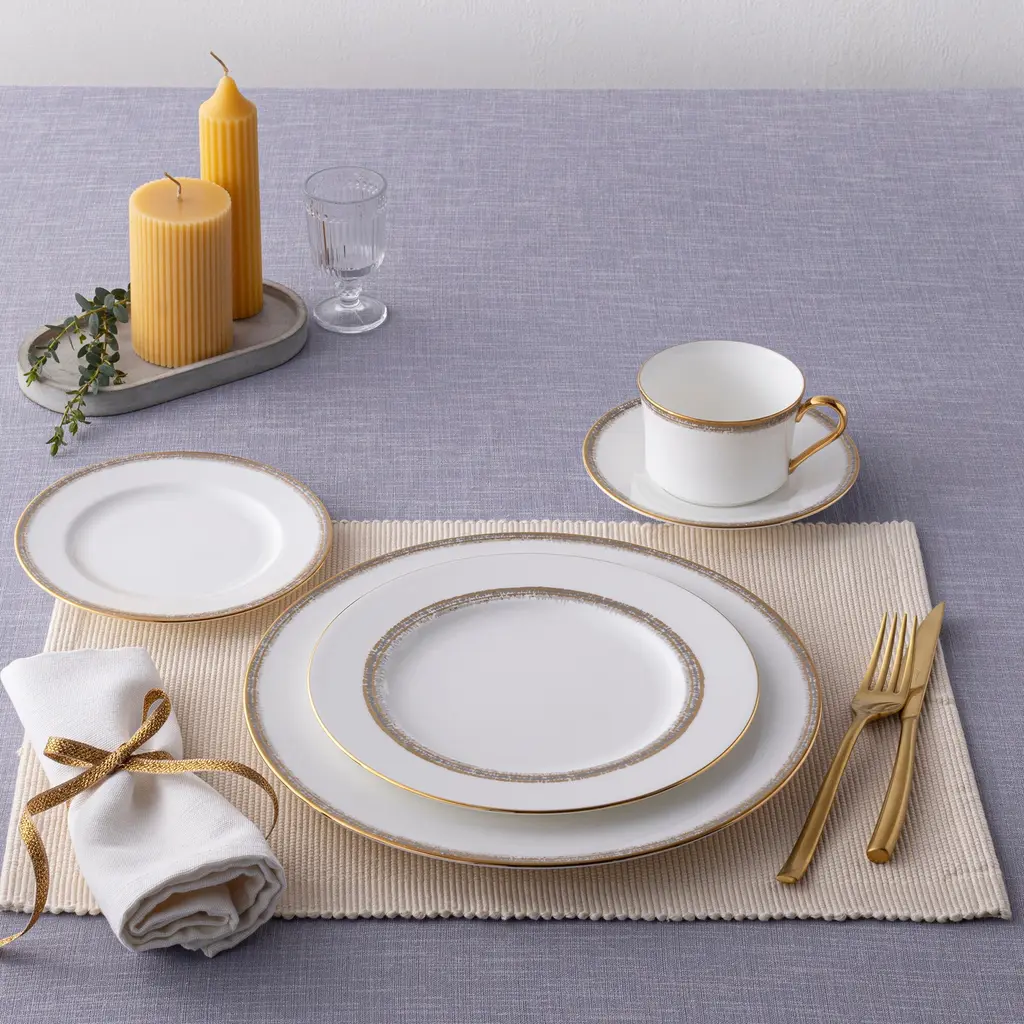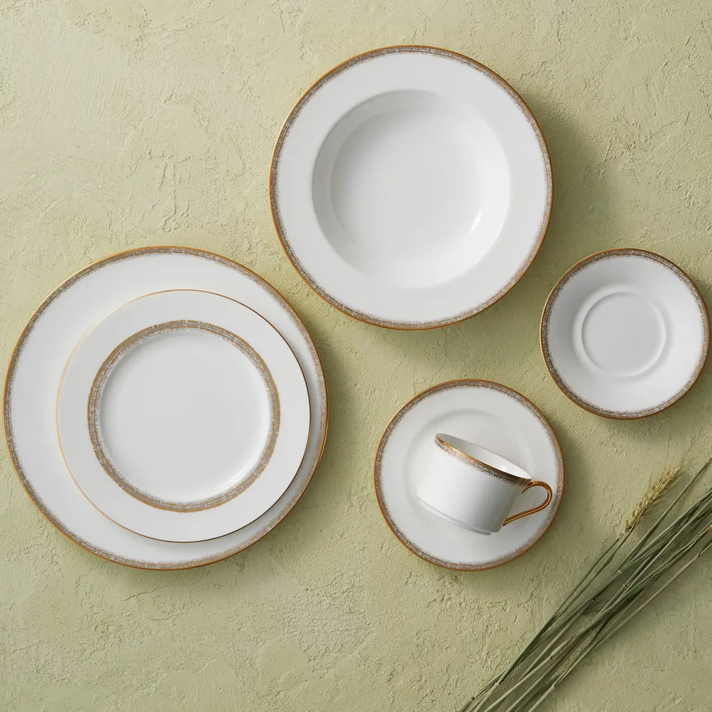 Haku features traditional gold banding, paired with a super-modern blurred edge featuring mixed metals on fine bone china. With a name derived from a Japanese proverb, Haku is designed to add value and joy to your meals. Haku offers place setting components as well as an array of serving pieces and accessories. Haku is suitable for everyday use and is dishwasher safe!