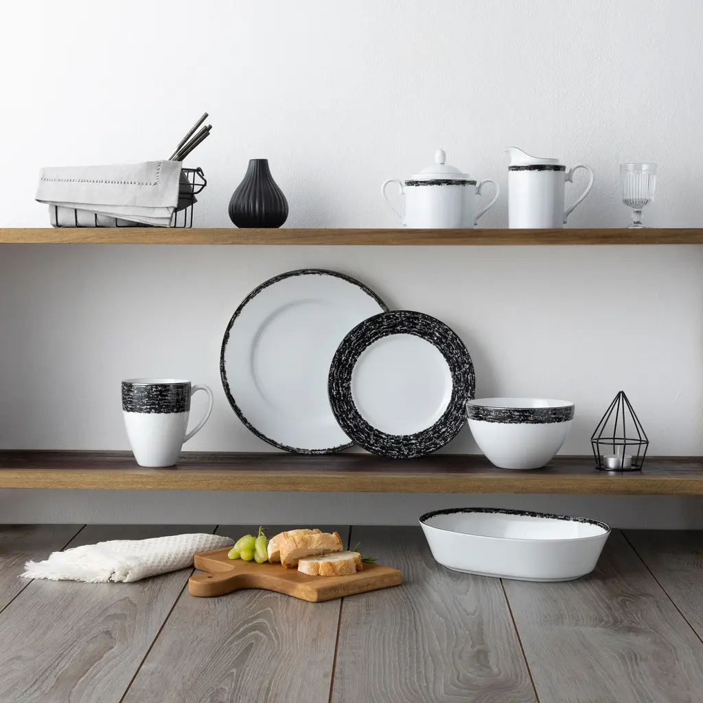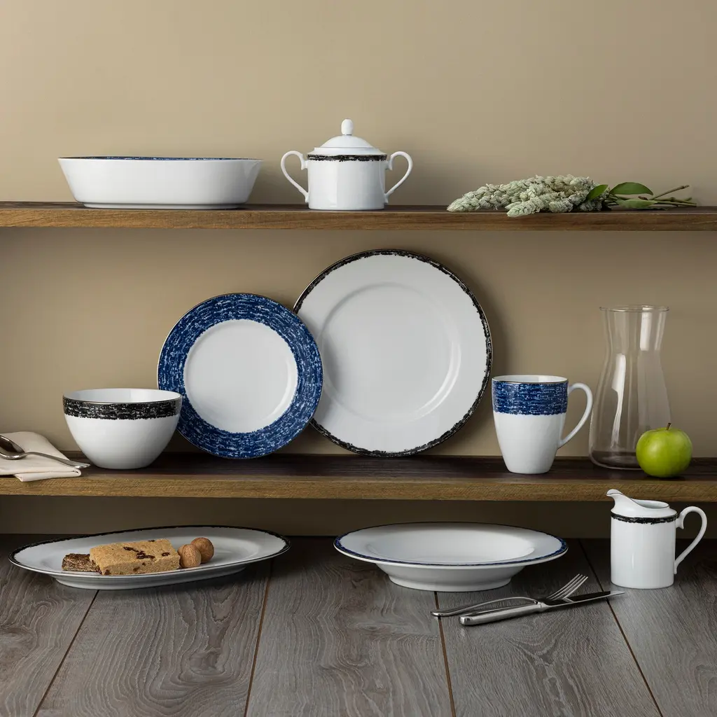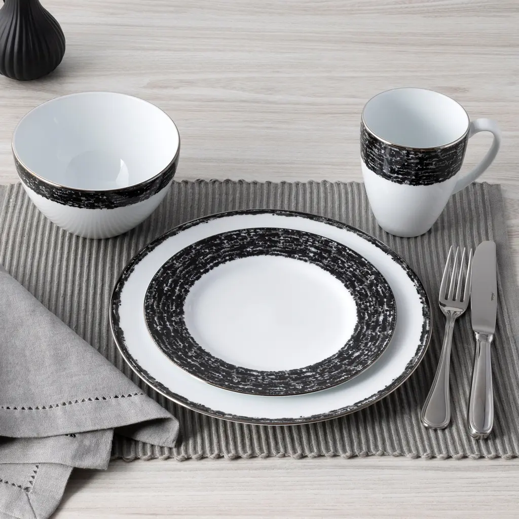 Rill showcases a bold presentation of dark tones on white porcelain. Each item features a classic outer band of microwave-safe platinum, while the shades of black or blue appear in a super-modern blurred composition. The amount of color presented varies per item, creating visual interest within the pattern itself. Rill is both microwave and dishwasher safe and intended for daily use.