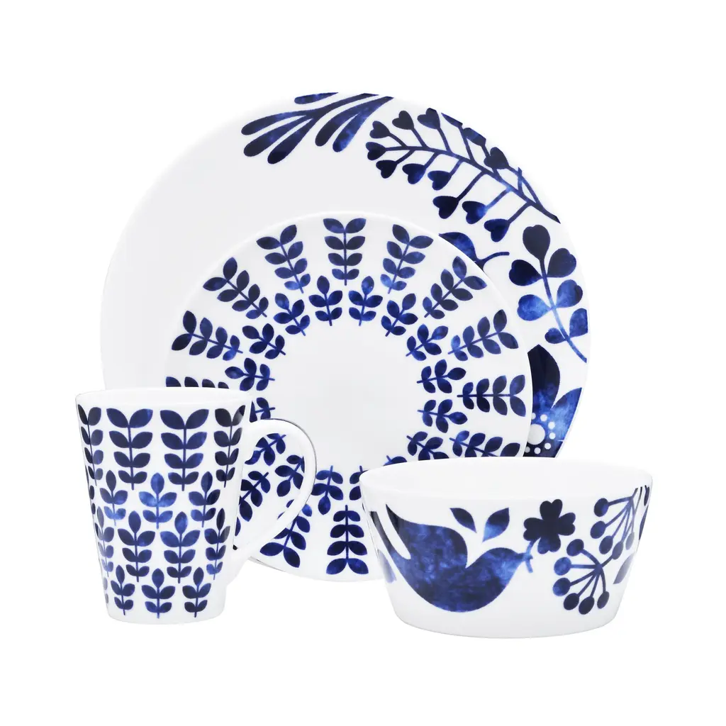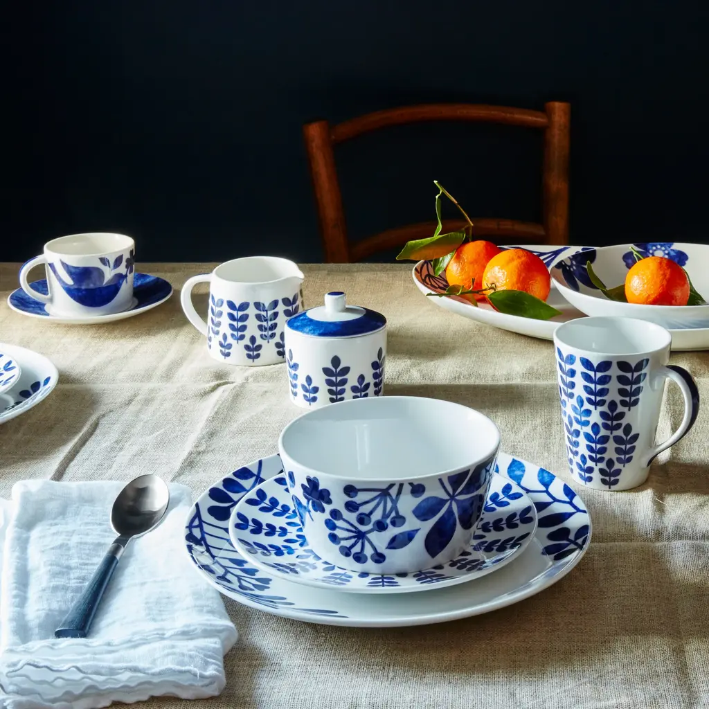Sandefjord is a Scandinavian-inspired design that is blooming with deep blue, whimsically-stylized floral motifs. Each piece incorporates these varied motifs in different ways. The variation of design continues with the accessory pieces, resulting in a complete, yet eclectic, collection.