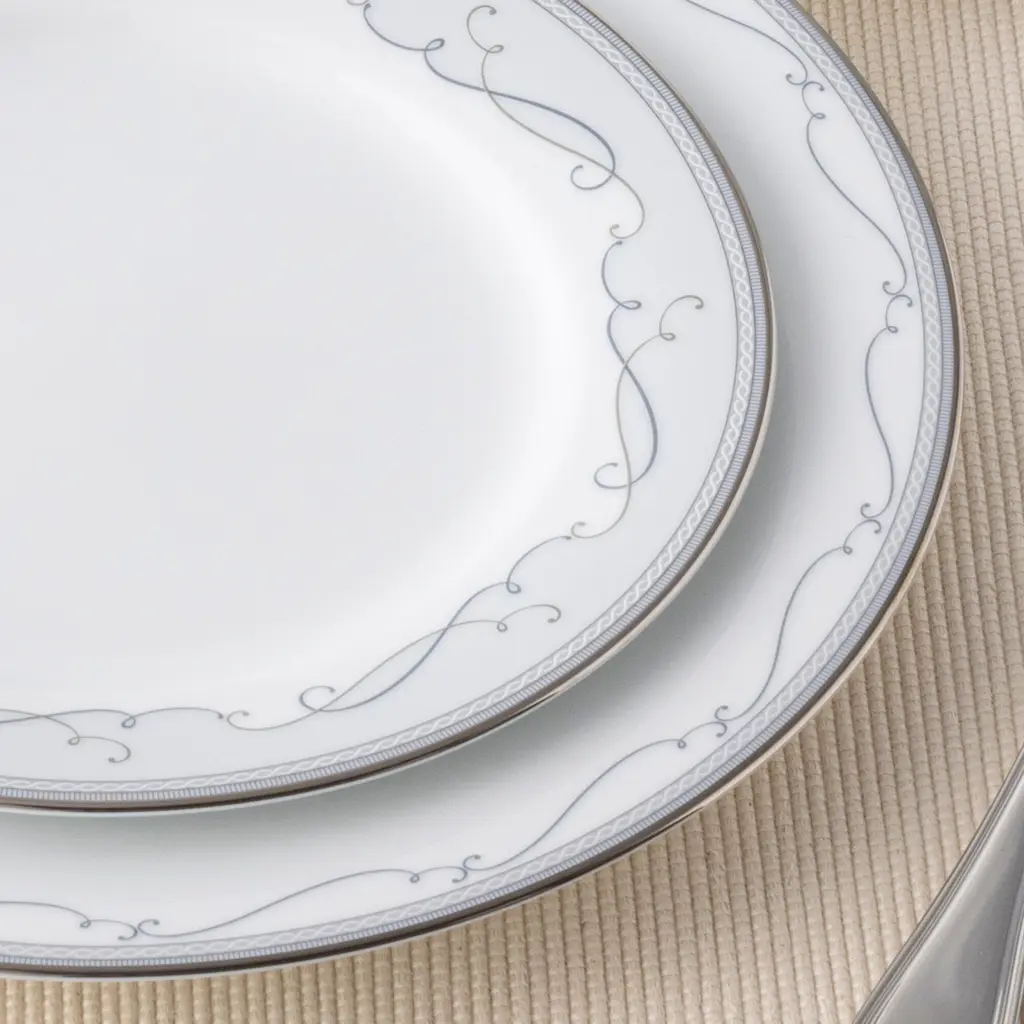 Satin Flourish is a timeless design on white porcelain. The classic scrolls are paired with a frieze-pattern border of both infinite loops and repeating lines. The edge is adorned with hand-applied platinum. Satin Flourish is both microwave and dishwasher safe, and intended for daily use.