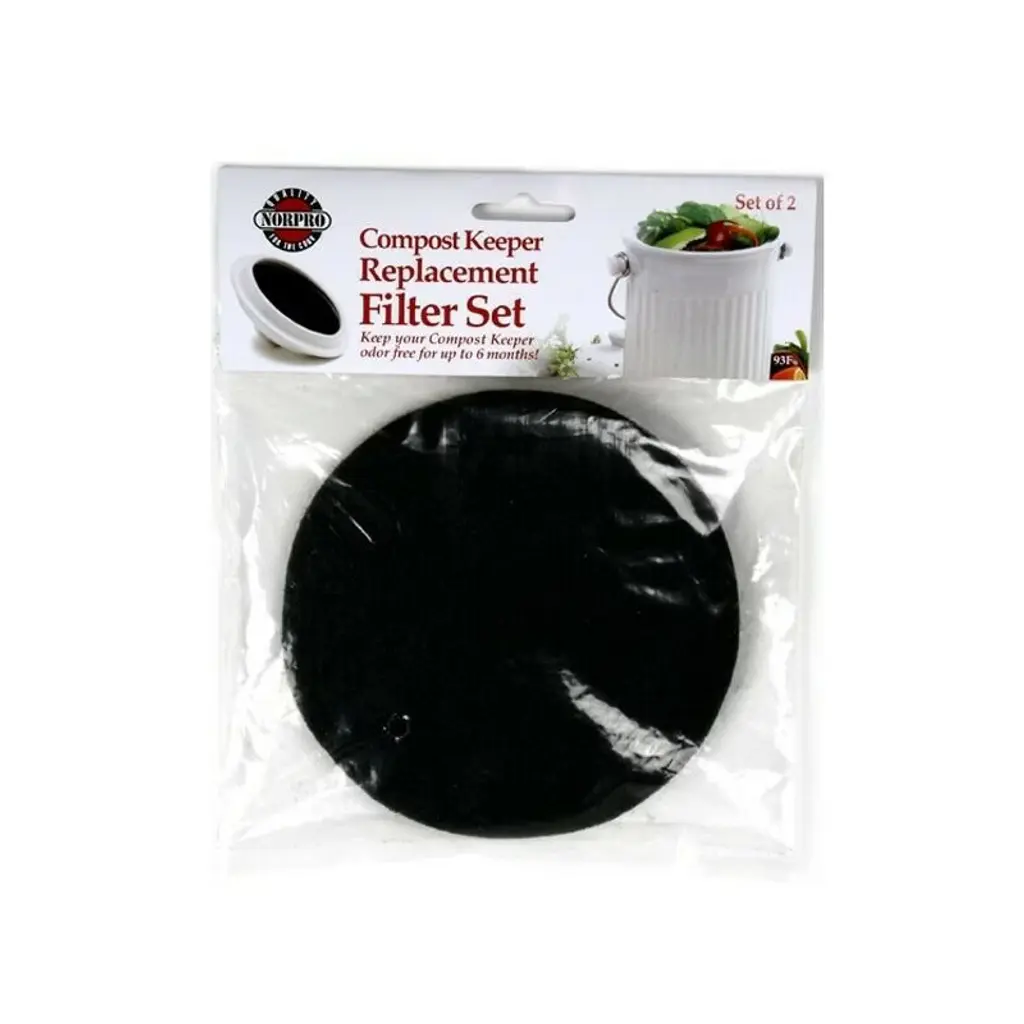 Fits Norpro Compost Keeper model # 83, 93, 93R and 93EB or other models that use a 5.5" diameter round filter. Charcoal filters help absorb odors that compost pails produce.Filters should be changed approximately every 6 months, depending on use, heat and humidity.Let food cool down before putting in your composter. Moisture from warm product can decrease the time for changing the filter.Do not wash and reuse the filter. The charcoal in the filter absorbs the odors and once it has fully absorbed to its maximum, discard filter.To replace filter, pull old filter out and toss. Inside replacement pack are two round filters. Only one filter is needed at a time and fits easily and snugly inside the lid.