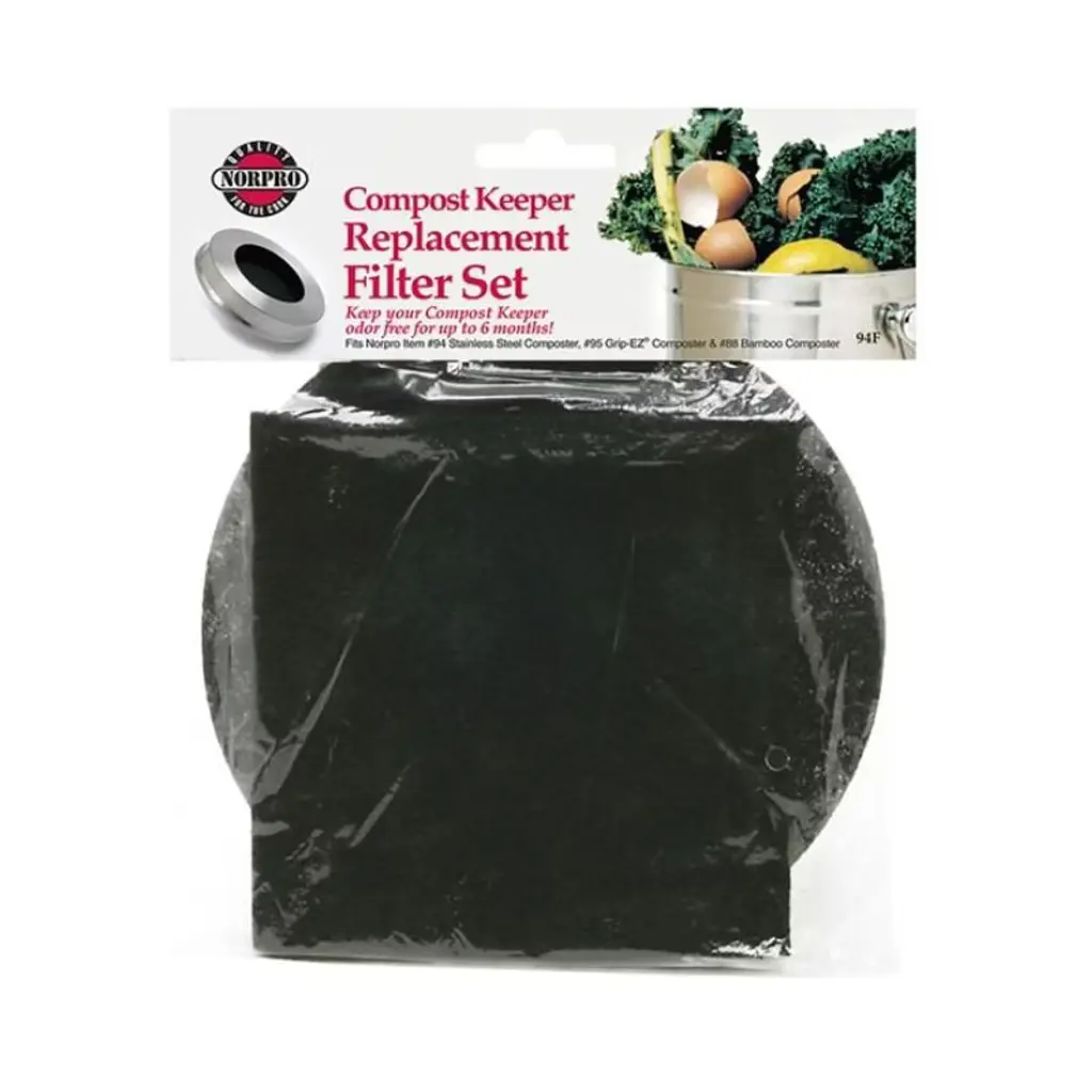 Fits Norpro Compost Keeper models # 94 and 95 or other models that use a 6.5" diameter round and 4.75" square filter. Filters help absorb odors that compost pails produce. Made as replacement filters for Norpro's stainless steel compost keeper, items #94 & #95.Filters should be changed approximately every 6 months, depending on use, heat, and humidity. Do not wash and reuse filters. To replace filters: just pull the old filters out and toss them. Inside the replacement packet are two filters: one square filter and one round filter. Insert the square filter first. Just push it into the lid next to the holes in the lid, using your hands. Insert the round filter second. It goes in the other part of the lid and does not touch the other filter. Just work it in with your hands.Tip: Let food cool down before putting it into the composter. Do not put hot or warm products into the composter. Moisture from warm products can decrease the life of the filter.