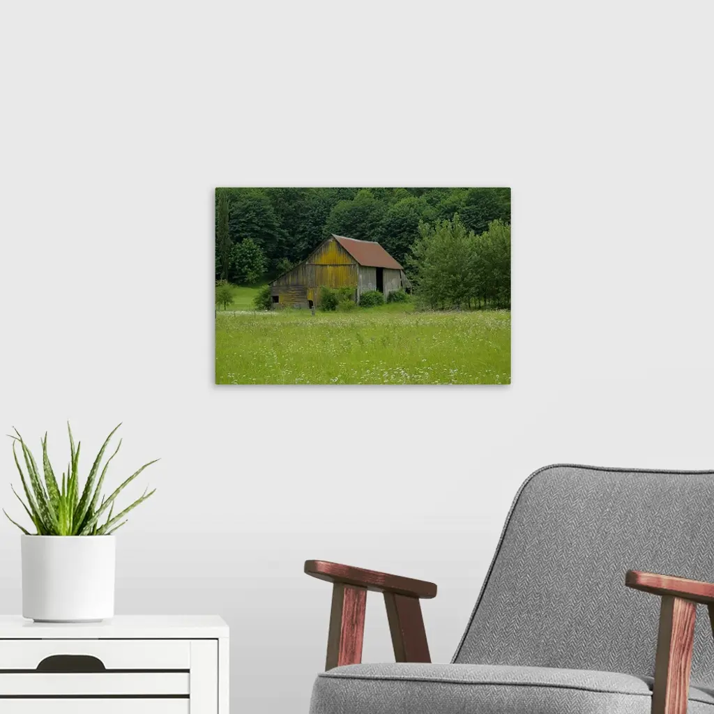 An old wooden barn near a forest at the edge of a field.