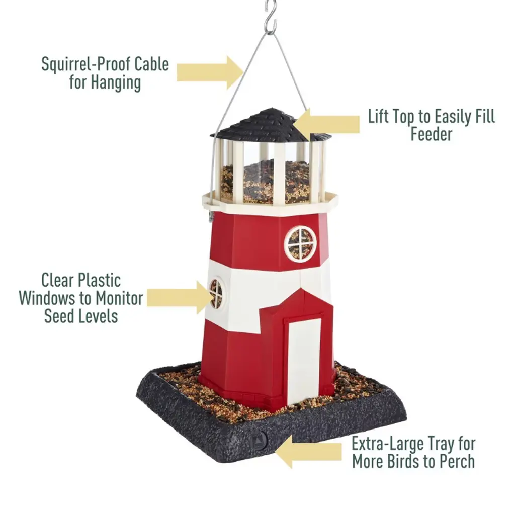 The Red Lighthouse Bird Feeder from North States Village Collection provides a place for your feathered friends to set sail on a culinary voyage in your backyard. This colorful birdfeeder resembles a miniature lighthouse with red and white siding. This unique design measures 9.5 x 10.25 x 14.5 inches high and holds 8 lbs. of seed. The lantern room at the top of the lighthouse is completely surrounded by clear plastic window panes to monitor seed levels. The top of the lighthouse lifts off to make filling this hopper feeder a breeze. The large tray/perch is removable for easy clean out. This versatile hopper style feeder is part of our popular Village Collection of feeders and can either be used as a hanging birdfeeder or pole mounted and offers a three year warranty. Let your backyard be a harbor of happiness while this feeder acts as a beacon attracting birds to gather for a nautical nibble. Gifts for bird lovers may be hard to find but this stunning birdfeeder is sure to brighten anyone’s day. Just wrap it up and present the ultimate birdwatching gift for any occasion.