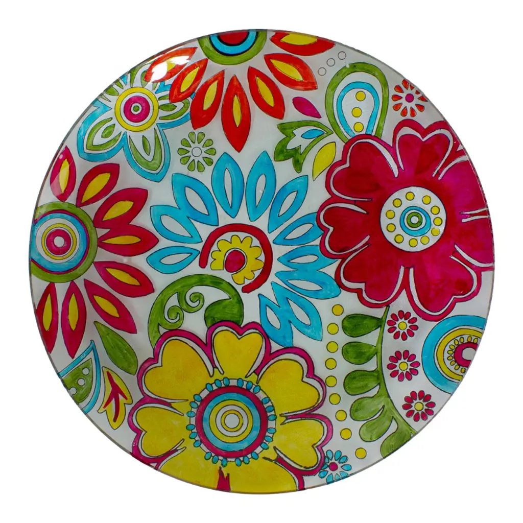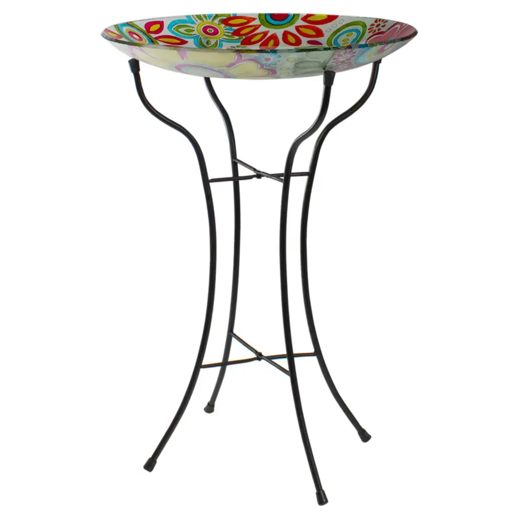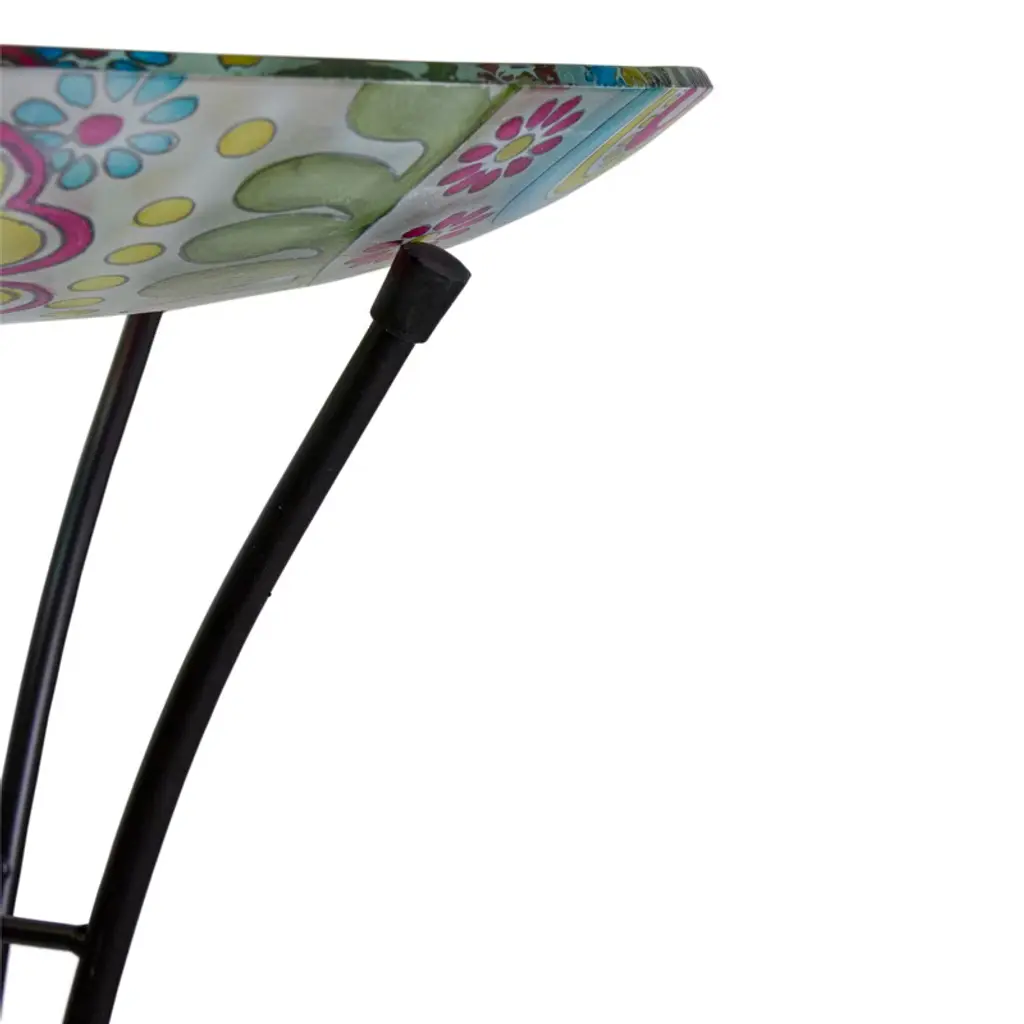 Enhance the aesthetic appeal of your garden with this charming glass bird bath feeder, guaranteed to infuse a vibrant splash of color into your outdoor space. Crafted in delightful shades of pink and blue, this birdbath feeder not only attracts the eye but also invites the cheerful presence of feathered friends. Meticulously constructed from premium materials, it promises durability and longevity, becoming a beloved fixture in your garden for years to come. Product Features: Bird bath features colorful images of pink and blue pastel flowers Glass can be placed atop a metal stand and can be filled with water or birdseed Black metal stand is included Perfect accent to add a splash of color to your garden Recommended for both indoor and outdoor use Dimensions: 25.75" high x 18" diameter Material(s): glass/metal