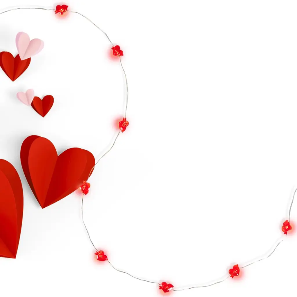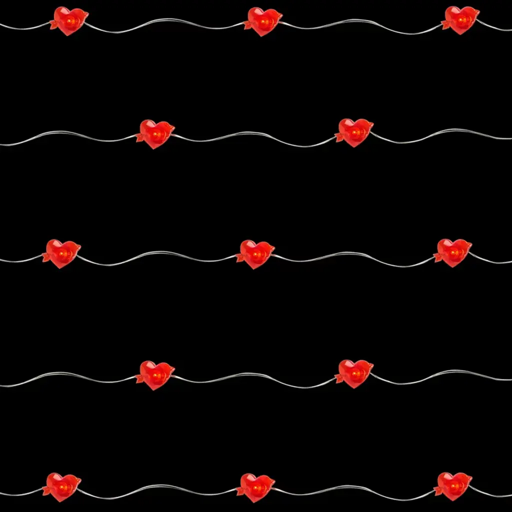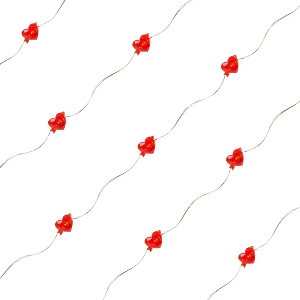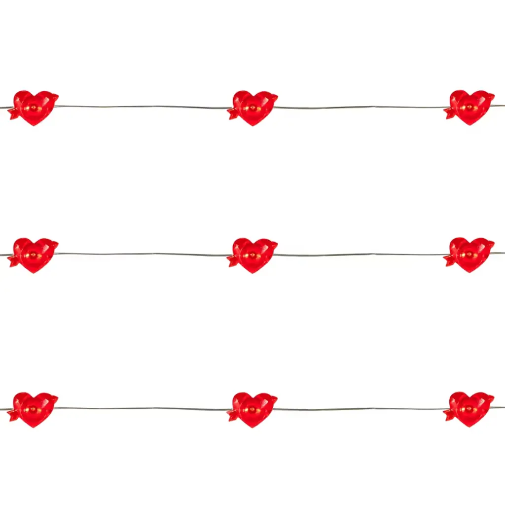 Set hearts aglow this Valentine's Day with our heart-shaped fairy lights. The red faceted hearts each house one warm white micro LED light. The facets allow the light to reflect beautifully, providing a warm cozy glow. The versatile silver-colored copper wire is durable and highly flexible, allowing you to bend and shape the lights quickly and easily for all your decorating needs. Product features: Color: warm white bulbs / silver copper wire Red heart and arrow light covers Number of bulbs on string: 20 Bulb size: micro fairy Bulb type: LED Spacing between each bulb: 4" Lighted length: 6.25' Total length: 7.5' 15" lead cord Additional product features: LED lights use 90% less energy Bulbs stay cool to the touch For indoor use only Requires (3) 'AA' size batteries - not included Convenient on/off switch on the battery pack Non-replaceable bulbs Cannot connect multiple sets together Heart dimensions: 0.5"H x 0.85"W Material(s): plastic/wire