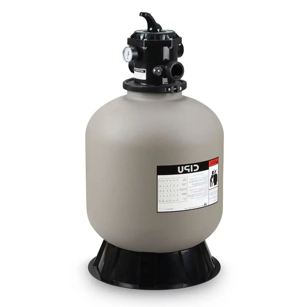 Keep your pool water crystal clear with our top mount sand filter. This series of sand filters use the latest filter technology. The filter is strong, reliable and simple to operate. Molded from a durable, corrosion-proof polymeric material, and engineered to maximize filtration and improve water clarity by evenly distributing pool water over the entire sand bed. It has all the features and quality that you as a customer require, which is designed for resort pools, hotel pools, municipal pools, and school pools. Product features: Filter is equipped with a multi-port valve and union connections for easy installation and operation The 6-position valve puts you in control while the easy-to-use lever-action handle lets you quickly dial any function Smart top diffuser ensures even distribution of water over the sand bed, which provides smooth, free-flowing performance High-performance impeller Corrosion-proof housing protects the filter system from severe weather for years to come Designed drain for rapid, all-weather performance Precision engineered self-cleaning laterals for balanced flow, backwashing, and easy serviceability Suitable for above ground or in-ground pools Specifications: 24" diameter filter 3.14 square foot filter area Max flow rate of 62 GPM Pressure gauge up to 50 PSI Uses 300lbs of sand