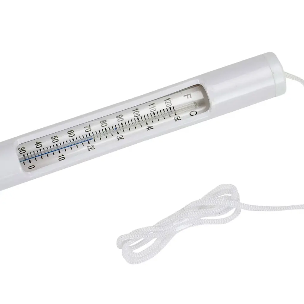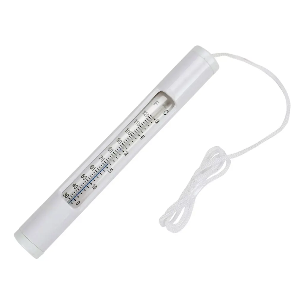 Easily keep track of your pool or spa temperature with this standard, easy-to-read thermometer. The thermometer features accurate, reliable temperature readings. It is an integrated pocket for water sample injection-mold. Product Features: Shatter-resistant body in white Durable nylon anchoring cord Reads both Fahrenheit and Celsius Dimensions: 6.75" high x 1" diameter Material(s): heavy duty plastic