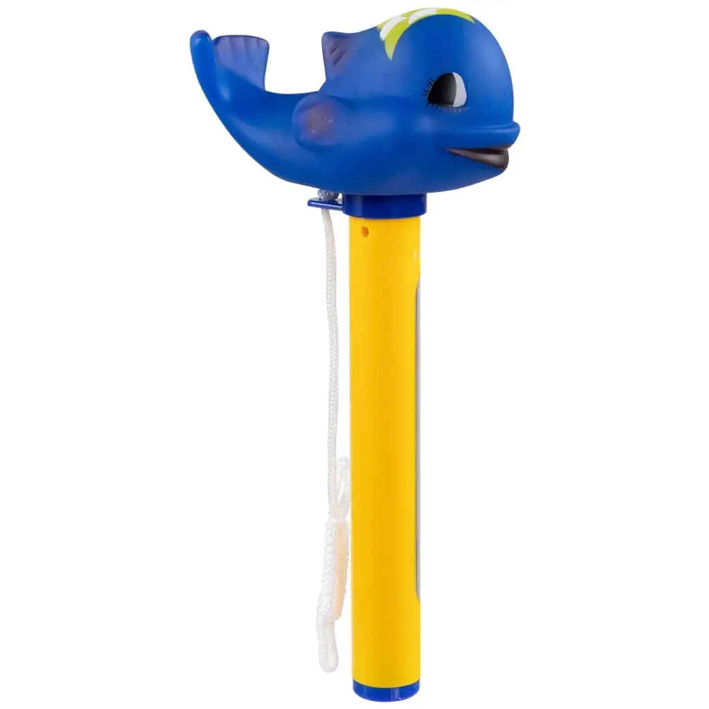 Add some fun to your pool with this adorable whale themed floating swimming pool or spa thermometer. Easily keep track of your pool or spa temperature with this standard, easy-to-read thermometer. The thermometer features accurate, reliable temperature readings. Product Features: Features a blue whale at the top of the thermometer Durable nylon anchoring cord Reads both Fahrenheit and Celsius Dimensions: 9"H x 4.5"W x 2.25"D Material(s): heavy duty plastic