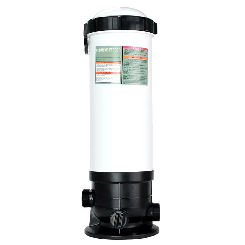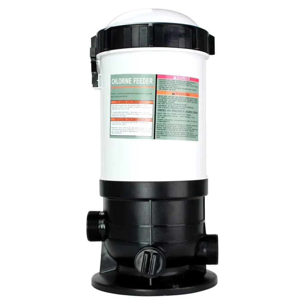 Efficient and maintenance-free, our durable corrosion-proof automatic chlorinators are ideal for new or existing pools or spas and work automatically with your pump and filter system. This automatic off-line chemical feeder is completely enclosed therefore there are no escaping fumes and it doesn't require any special venting. The easy-to-use integral dial control valve lets you accurately adjust the rate of chlorinating needed to keep your pool and spa sanitized. Off-line chlorinators are especially important when there is no room to plumb an in-line chlorinator properly or conveniently, and they are easily installed. Product features: Off-line chemical feeder 50lb tablet capacity For use with 3" slow dissolving chlorine tablets Dial control valve lets you control and adjust the rate of feed Threaded cover for safe and convenient access to add tablets Corrosion resistant construction for long lasting life Enclosed system No special venting required Fits off-line to most PVC Simple and easy installation Pressure gauge up to 50 PSI Max output: 50lbs/hr
